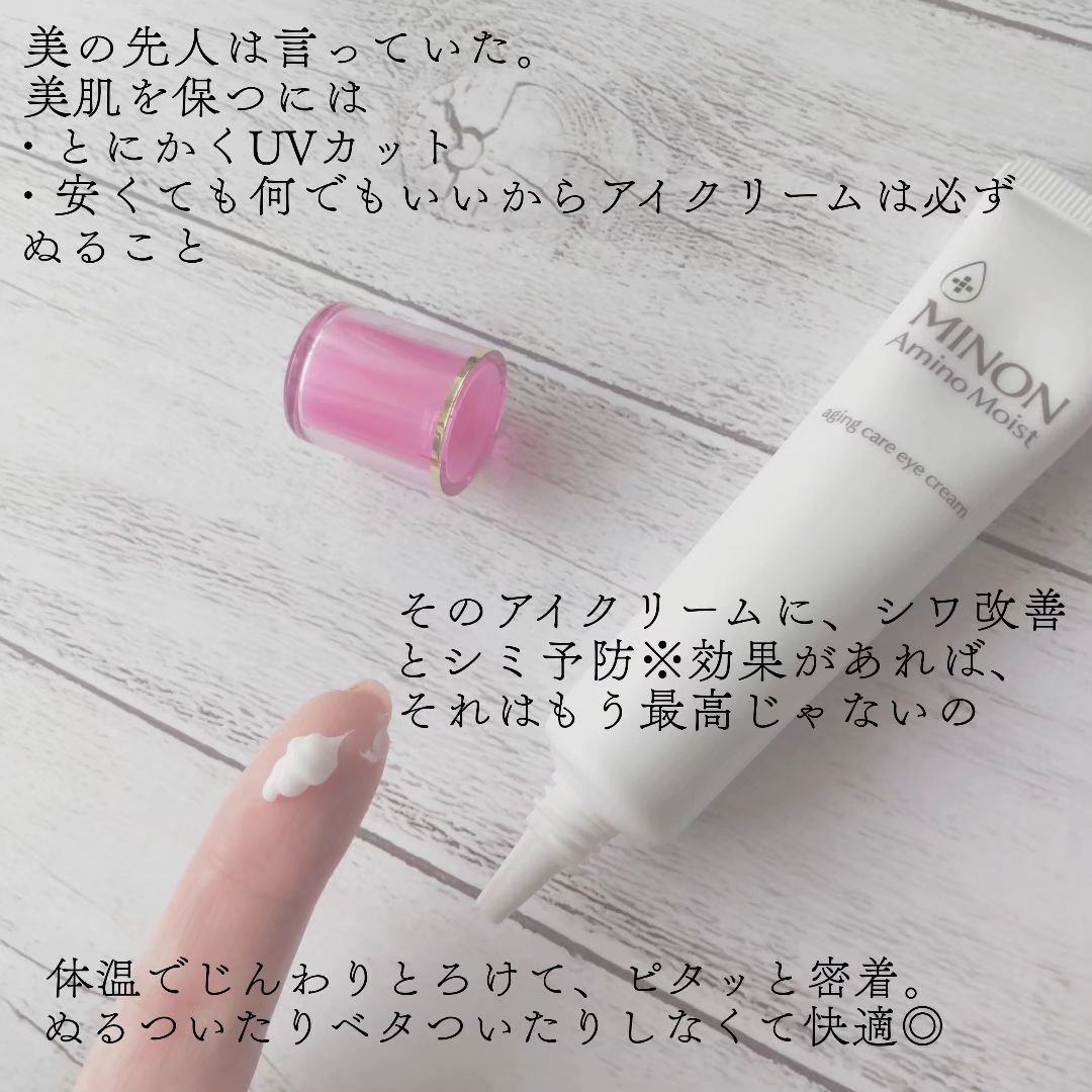 - 【敏感肌も使える薬用シワ改善アイクリーム】 ダブルの有効成分配合。気になるシワを改善し、しみ・そばかす*1、肌あれを防ぎます。 ●ナイアシンアミド:シワ改善&しみ予防 ●グリチルリチン酸2K:肌あれ予防 ハリを与えつや肌に導く「ハリシェイプペプチドWR*2」配合。 使い続けるたび、シワを改善し、うるおってハリのある明るい印象の目元へ。 エイジングケア:年齢に応じたお手入れケア *1メラニンの生成を抑え、しみ・そばかすを防ぐ *2ヤシ油脂肪酸水解コラーゲンK (販売名:ミノンアミノモイストAE)【医薬部外品】