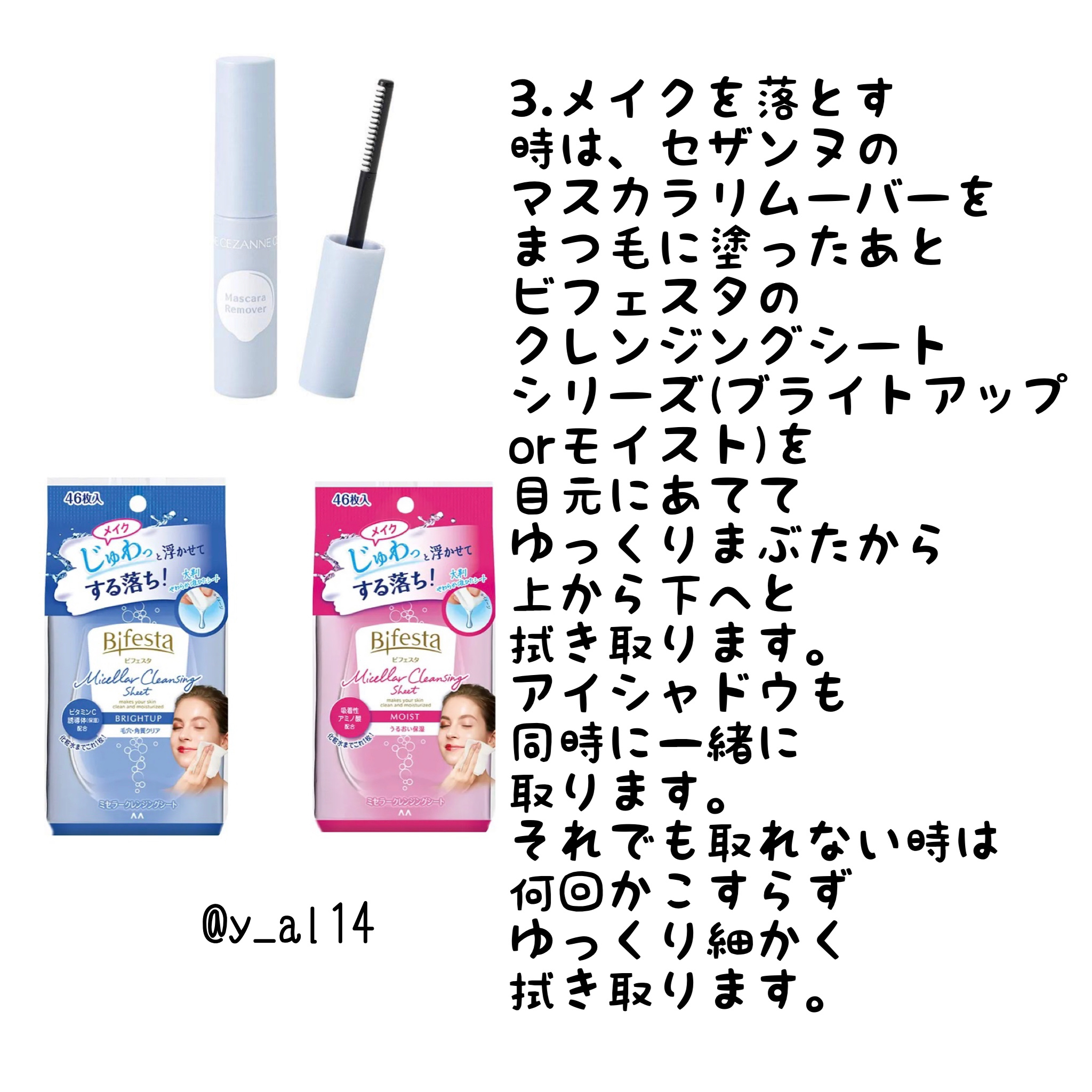 ビューラーはシュウウエムラを使用。 その次にキャンメイクのクイックラッシュカーラー透明タイプでまつ毛を固めたあと、その日の気持ちで好きな手持ちのマスカラをその上から使っています。 メイクを落とす時は、セザンヌのマスカラリムーバーでまつ毛に塗ったあと、ビフェスタミセラークレンジングシート ブライトアップorモイストを目元にあててゆっくりとまぶたから上から下へと拭き取ります。 最後にFANCLのクレンジングオイルでベースメイクなど全体を洗う時に、一緒にその部分も洗い流してその後FANCLの泡洗顔を使います。
