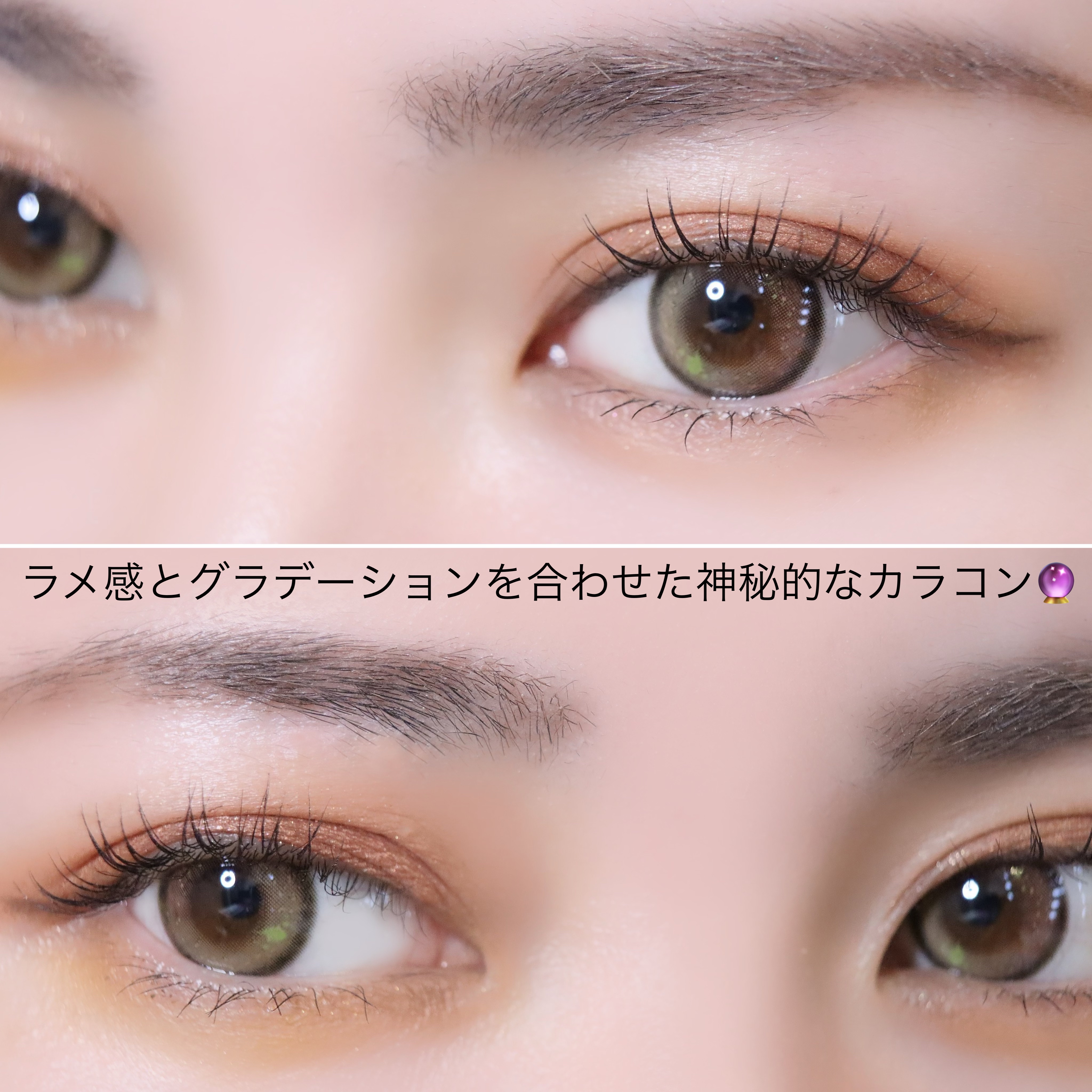 このカラコンかなり個性的で盛れる! 瞳の中に銀河が映ったような絶妙なラメ感、エメラルド色のドットポイントがまた神秘的な目元を演出してくれるよ㊗️ クールグレイとベージュブラウンのツートンカラーが透き通るくりんとしたビー玉のような瞳にみせてくれるの🫧🫧 個性的ではあるんだけど、そこまで違和感もかんじないし、何より私の瞳にはあってるみたいでつけ心地も良かった✨ 黒目が立体的に見えて、とっても可愛いよ⭕️