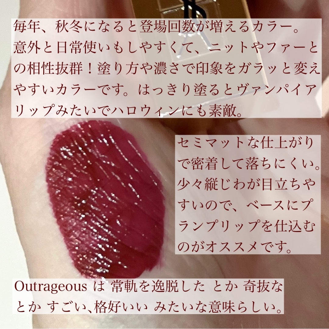 初めて名前で購入を決めたものの、コンセプトもさることながら、みずみずしいテクスチャーでしっとりするのに軽い着け心地! これ1本でグロスを塗ったかのような、綺麗な艶がうまれます。 シアーな発色も調整がしやすいので、一見かなり濃い色に見えますが、色持ちも程よく塗り方次第でデイリーにも使いやすいと感じました。 でも、重ね塗りした時の深い赤もたまらない!! これを黒いコートに合わせたら絶対かっこいい!などと色々想像も膨らみます💭 黒から透明になりブランドロゴが浮き出てくるパッケージもお洒落です。 古典文学からインスパイアされて作られているDintoさんはブランドコンセプト自体もとても素敵。一気に虜になってしまいました💘