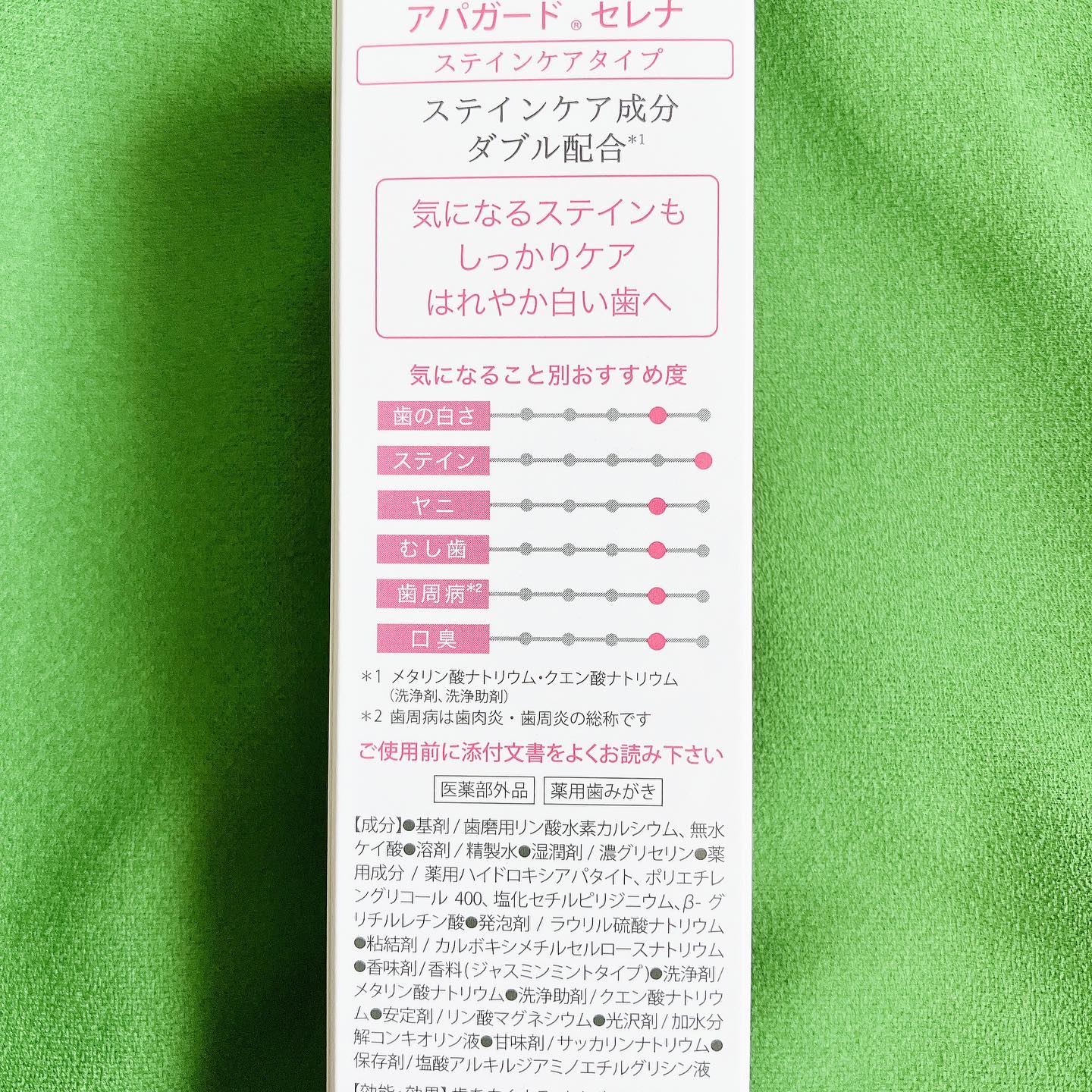 - 【医薬部外品】 美白歯みがき「アパガード」シリーズのステインケアタイプ。サンギ開発のむし歯予防成分「薬用ハイドロキシアパタイト」を配合。歯とほぼ同じ成分(歯のエナメル質の97%はハイドロキシアパタイト)で、エナメル質にアプローチ! さらにステインケア成分をダブル配合*し、コーヒーや紅茶・ワインなどの気になる着色汚れを落とします。 ステインケアではれやか白い歯に。 *メタリン酸ナトリウム(洗浄剤)・クエン酸ナトリウム(洗浄助剤) ●医薬部外品/薬用歯みがき 販売名:サンギMSR