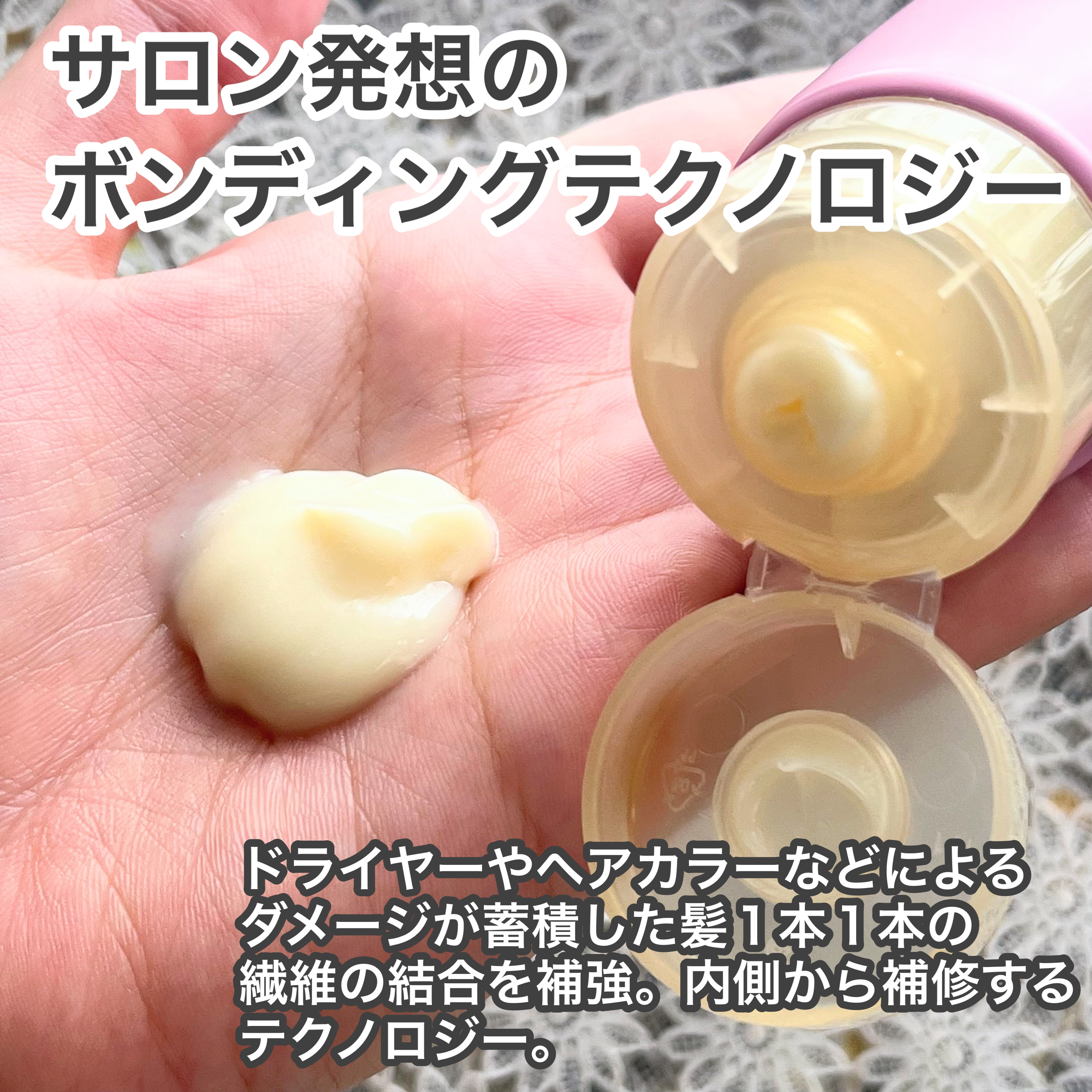 - 2024年11月1日~パッケージリニューアル ~カラー後の色落ち・ダメージに*~ 蓄積ダメージを補修し「素髪力」みなぎる髪へ*2 サロン発想「ボンディングテクノロジー」が髪を繊維レベルで補強 使ったその日から、+4週間*3 綺麗な髪色長持ち。 カラーシャイン&リペアシャンプー、トリートメントとの併用でより高い効果を。 <使い方> ボンドリペア カラーシャイン&リペアシャンプー・トリートメント後、 クリームを手に取り、髪全体にやさしくなじませます。 30秒程おいた後、洗い流します。週3回の使用がおすすめ。 *カラーシャイン&リペアヘアマスクを含むシリーズ使いによる *2ダメージ補修による髪の補強と質感ケア *3ブランド調べ。4週間持続性確認済み。個人差があります。