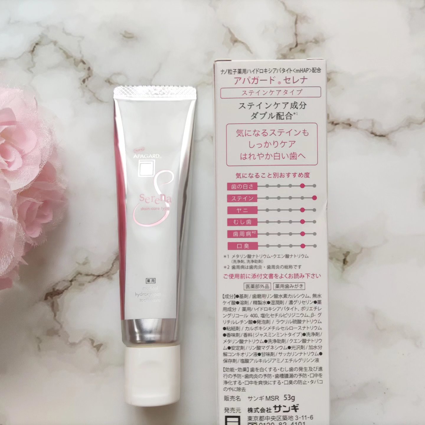 - 【医薬部外品】 美白歯みがき「アパガード」シリーズのステインケアタイプ。サンギ開発のむし歯予防成分「薬用ハイドロキシアパタイト」を配合。歯とほぼ同じ成分(歯のエナメル質の97%はハイドロキシアパタイト)で、エナメル質にアプローチ! さらにステインケア成分をダブル配合*し、コーヒーや紅茶・ワインなどの気になる着色汚れを落とします。 ステインケアではれやか白い歯に。 *メタリン酸ナトリウム(洗浄剤)・クエン酸ナトリウム(洗浄助剤) ●医薬部外品/薬用歯みがき 販売名:サンギMSR