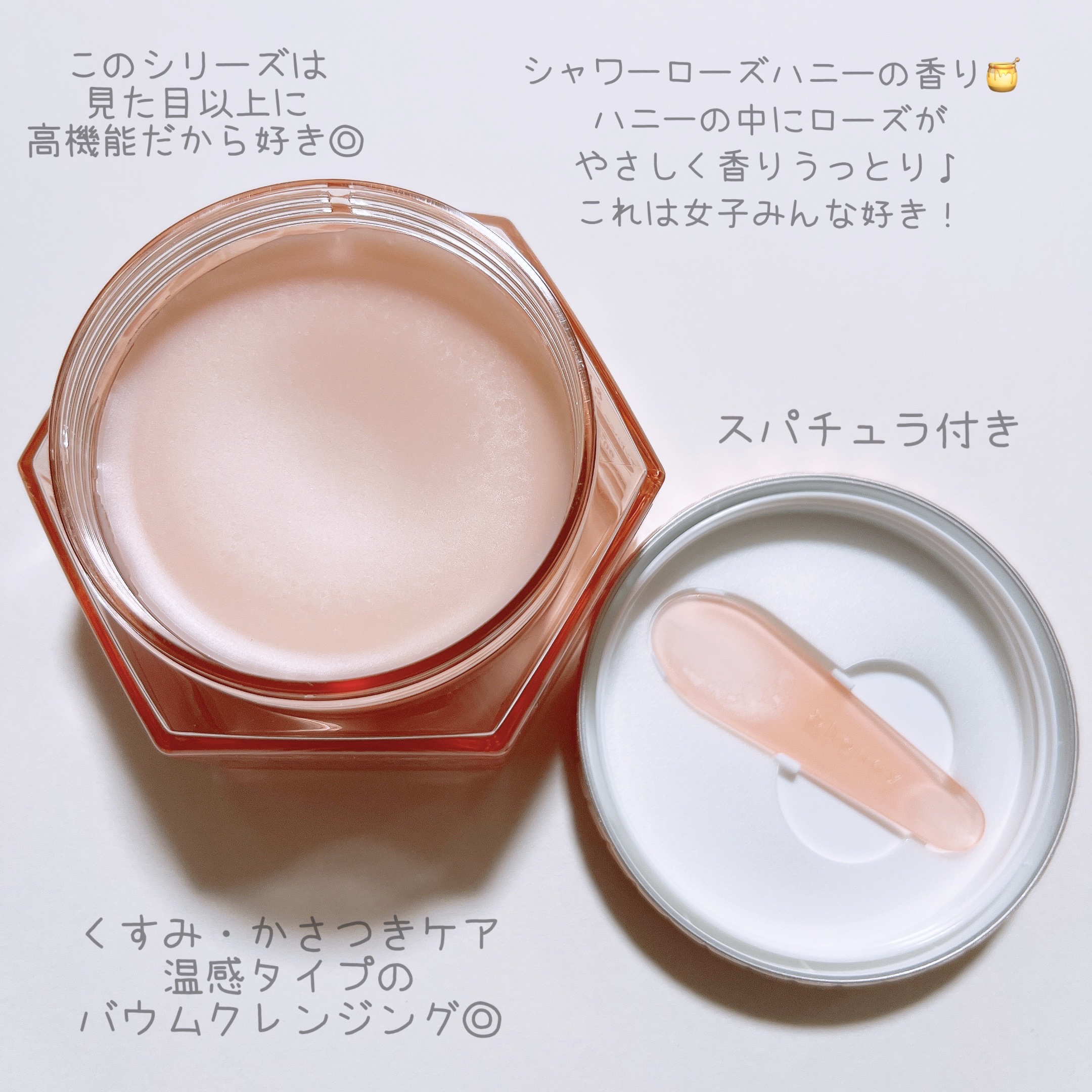- &honey クレンジングバームから じんわりあったか温感バーム【メルティホット】シリーズ とろけるあったかバームがじんわりお肌をやわらげることで、 メイクや古い角質を浮かし、なめらかなお肌へ導きます。 製品の90%以上を保湿・整肌成分で構成しW酵素成分を配合することで、くすみ※をケアして肌トーンUP 香りは甘く華やかなシャワーローズハニーの香り。 ※古い角質や汚れによる
