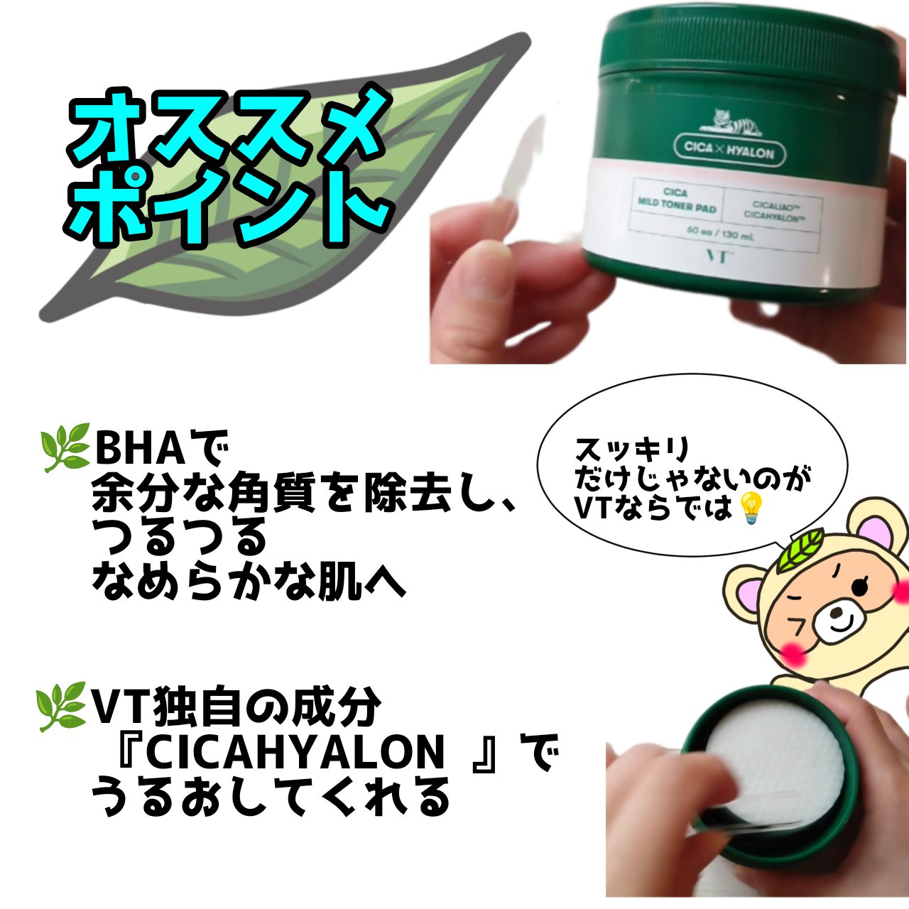- <CICA マイルドトナーパッド> 水、グリセリン、BG、サリチル酸、ツボクサエキス、ヒアルロン酸Na、アシアチコシド、マデカッソシド、マデカシン酸、アシアチン酸、プロポリスエキス、ホソバニンジンエキス、ハマメリス葉エキス、セイヨウシロヤナギ樹皮エキス、アラントイン、β-グルカン、トロメタミン、コハク酸ジエトキシエチル、クロルフェネシン、ラウリン酸ポリグリセリル-10、ミリスチン酸ポリグリセリル-10、エチルヘキシルグリセリン、デキストリン、クチナシ果実エキス、EDTA-2Na、トコフェロール、プロパンジオール、ベタイン、グリチルリチン酸2K、香料、1,2 -ヘキサンジオール