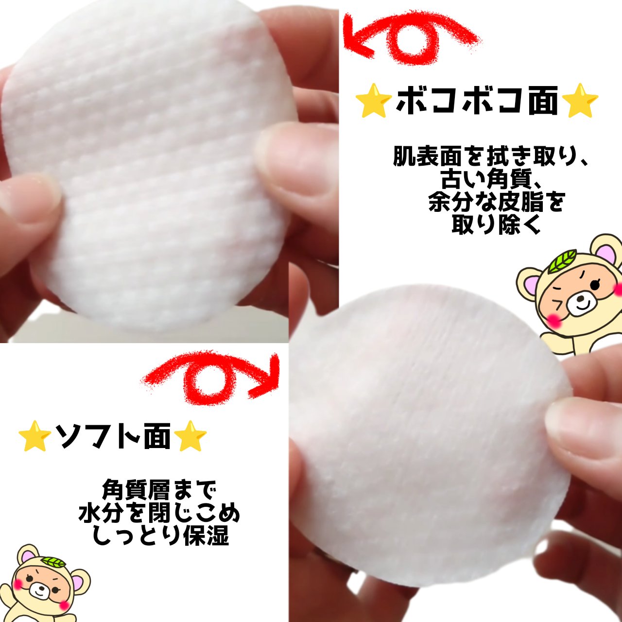 これ1枚で角質ケア、保湿と集中パックまで! ベタつく皮脂や肌の老廃物をふき取り、乾燥した皮膚に水分補給🚰 キメ細かい肌へ導く両面トナーパッド! デコボコの面は角質ケア、肌のザラつきが気になる時に使うと肌がなめらかになります! ソフトな面の方はパックとして使ってます!! 私は敏感肌ですが荒れることなく使えました!! シートはサッパリしてるのにしっかり肌が潤う!!