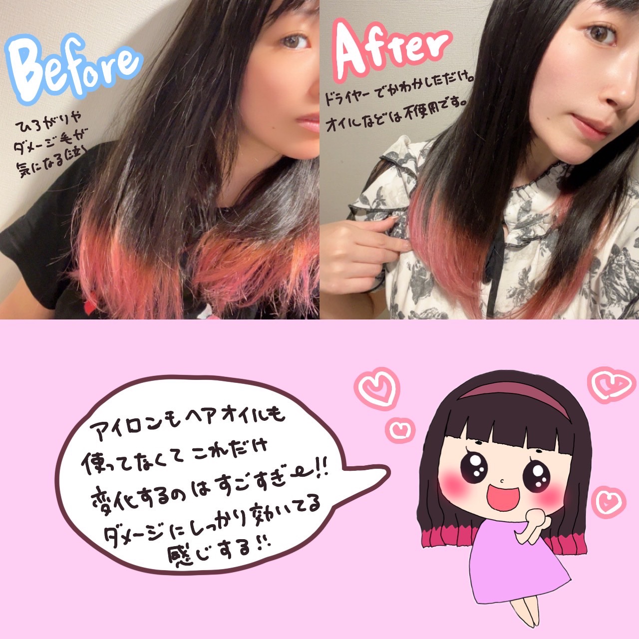 時間がかからないのがほんと良い🥺💕 かけた瞬間じんわりあったかいのが浸透してる感じする〜!! 毛先のブリーチは4回くらいしててダメージと広がりが気になってたんだけどトリートメント後にドライヤーしただけでだいぶ髪がまとまったよ⸜🌷︎⸝ 変化がすぐわかるからうれしかった✌️