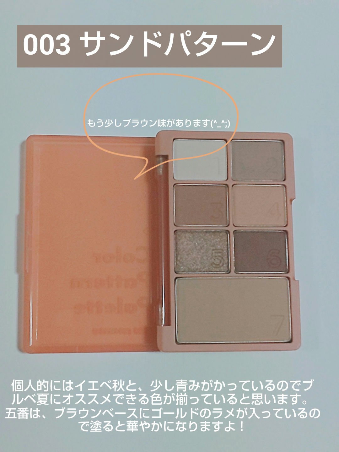 特別粉質が良くてデパコス並みとは言えないので、リピはなしです。 色味は、黄みと暖かみのあるベージュ系で、イエベさんにオススメです! マットが5色、マットベースにラメが入っているのが1色、ラメが3色のベースの色から締め色まで揃っている9色アイシャドウパレットです!