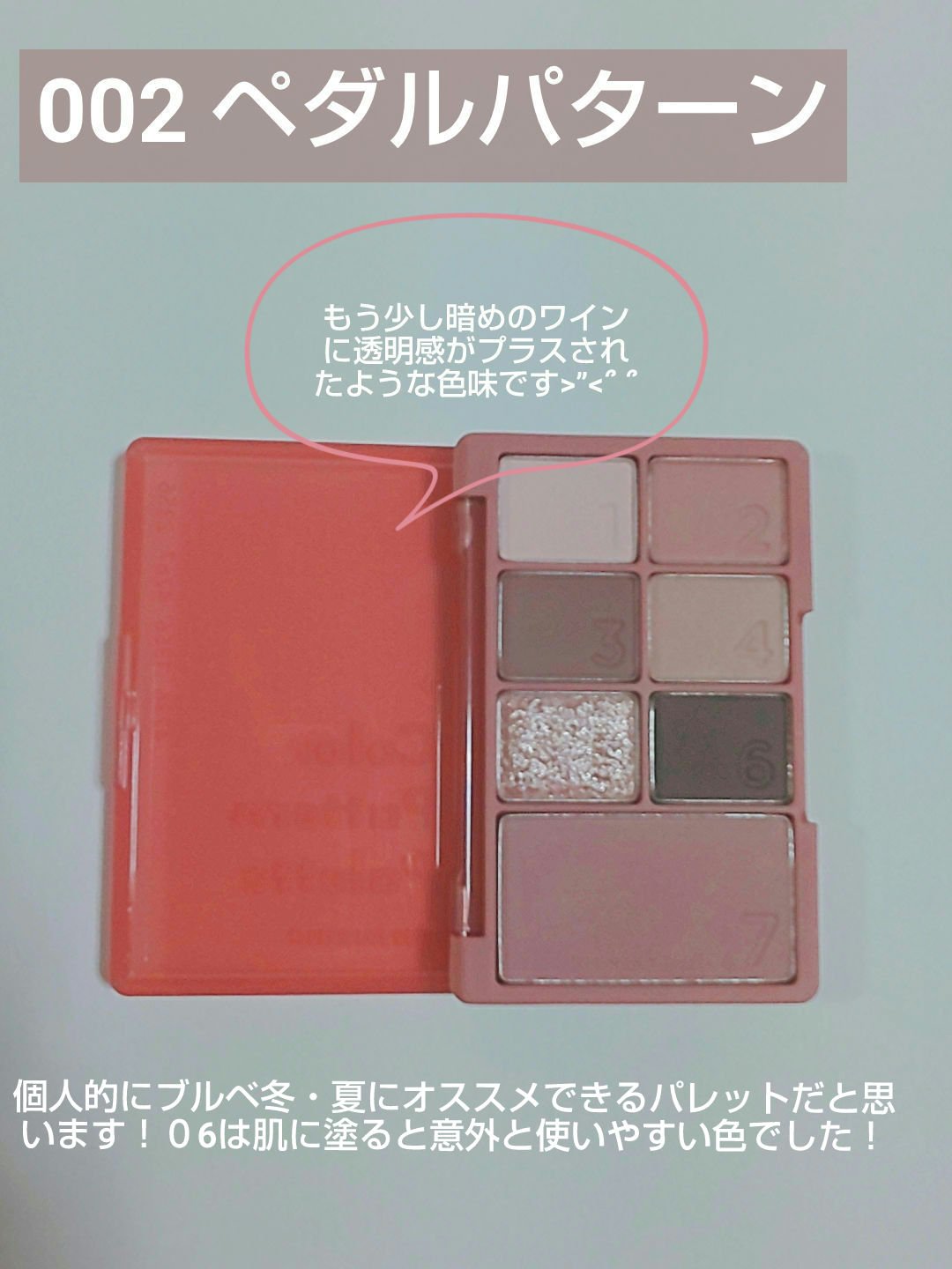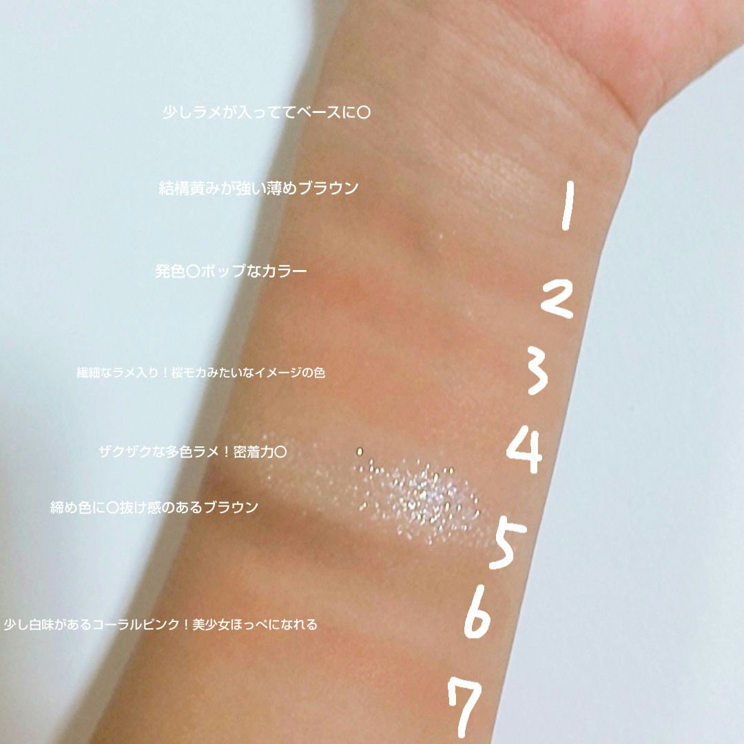 まず、パケがザ・韓国コスメな可愛いパケで優勝です✨ 3色展開で、ラメ1色チーク1色マット5色の、ベース色や締め色も入ってる使いやすいパレットです! ラメはザクザクで、密着力もあるのでラメ飛びしにくいです!3色どれも華やかな印象のラメが入っています! マットは粉質がしっとりしていて、しっかり密着します! 捨て色なしの粉質〇なので、本当におすすめなパレットです!買って損は無しです!