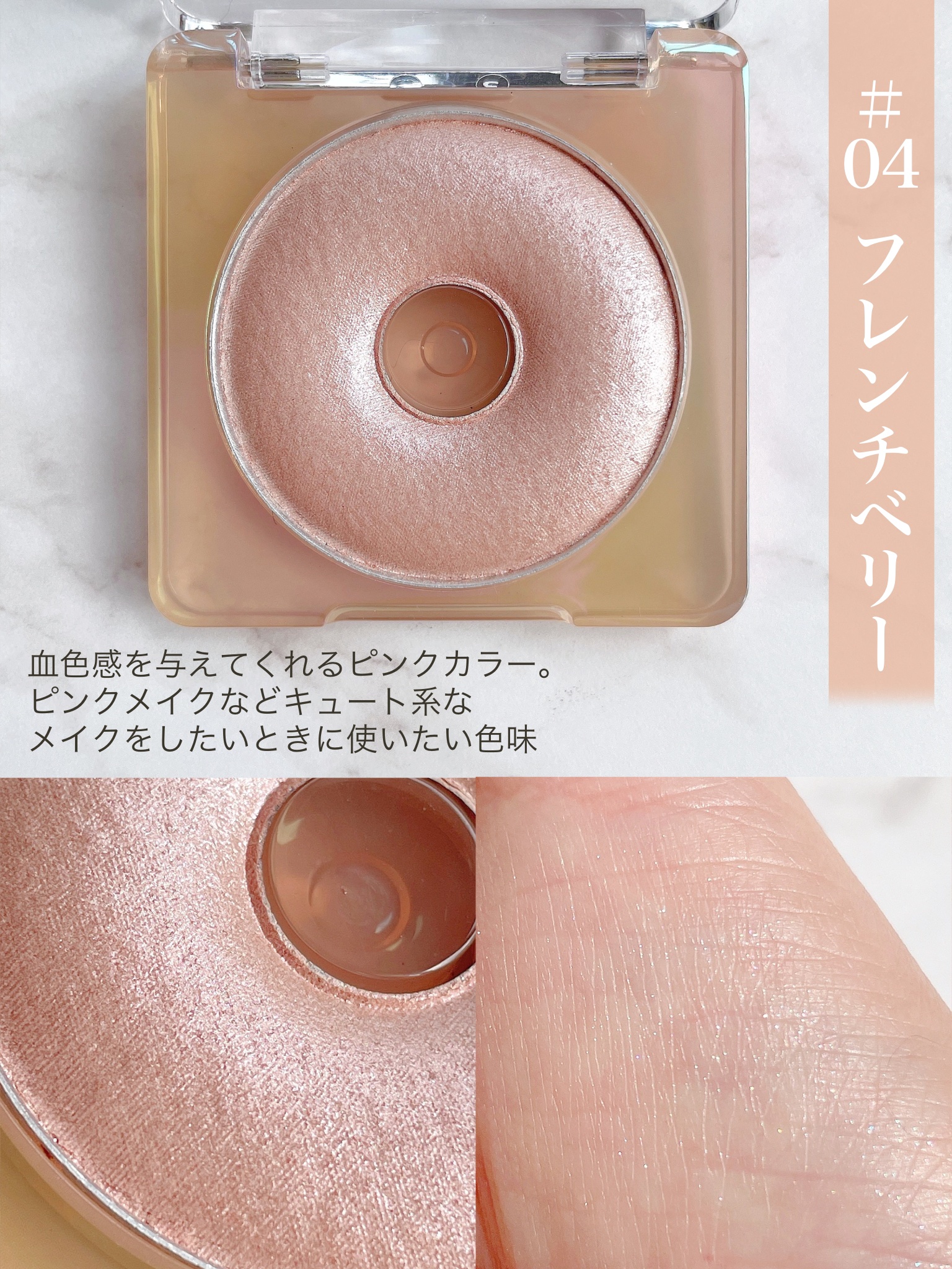- すっと肌に溶け込むように馴染み、自然な立体感とツヤ肌を演出するドーナッツ型の可愛いハイライト。 可愛さと実用性を兼ね備えたコスメ。 <#01シュガーバター> シャンパンベージュカラーで透き通ったような肌を演出します。 <#04フレンチベリー> ナチュラルピンクカラーで血色感と若々しい印象を演出します。
