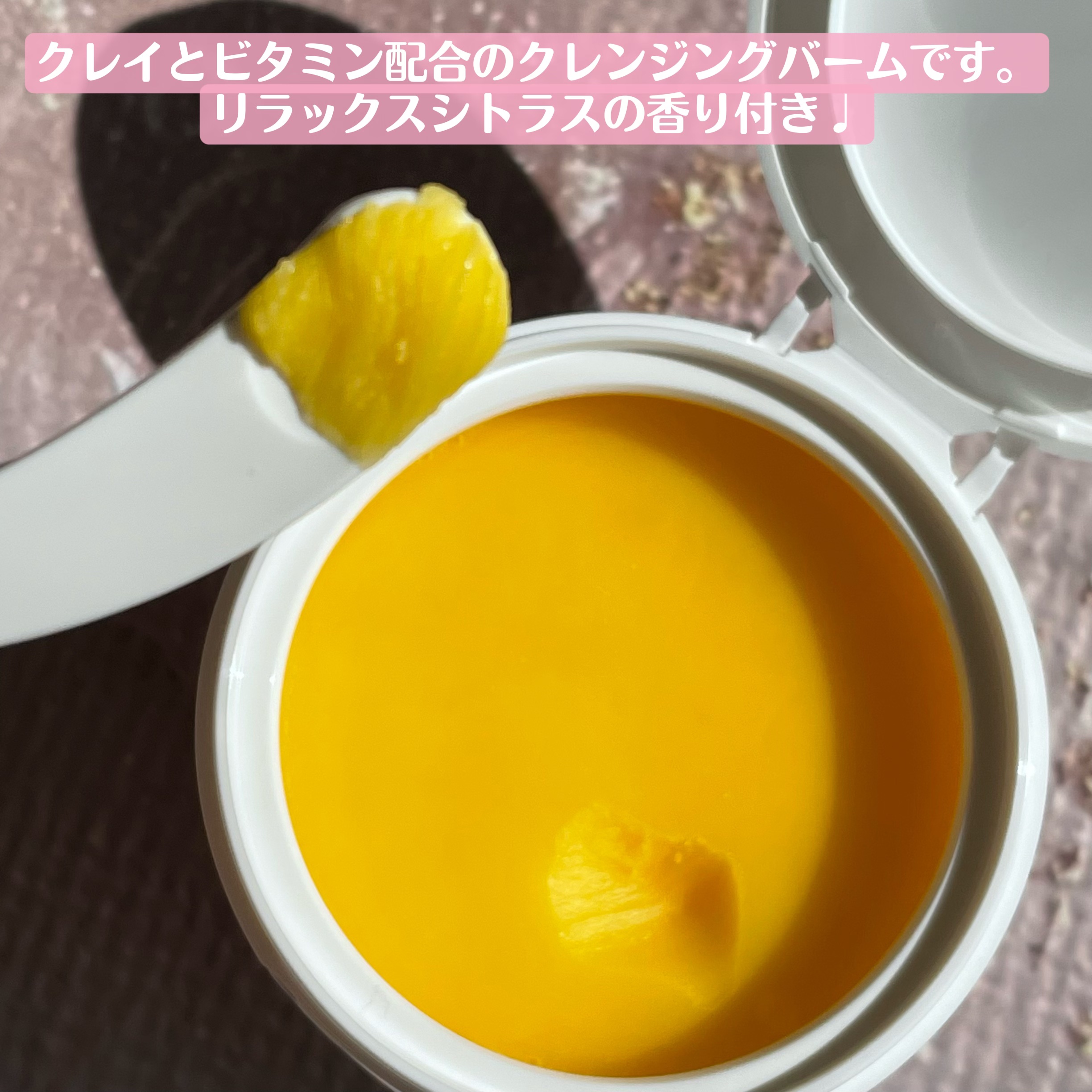 - クレイ*1×浸透型*2ビタミンC誘導体【APPS】*3配合で、毛穴ケアと同時に透明感ケアを叶える濃密すっきりクレンジングバーム。この1つでクレンジング・洗顔・角質ケア・マッサージケア・保湿美容パックの5つの機能を兼ね備え、毛穴のざらつき・くすみ*4・黒ずみ*4も、すっきり落とします。 肌に乗せるとバターのようにとろけてオイル状に変化するテクスチャーで肌への摩擦が少なく、顔全体をマッサージもすることができます。しっかりメイクや毛穴のガンコな汚れにもとろけるように馴染み、クレイ*1×ビタミン*3の力で酸化皮脂や古い角質、黒ずみ汚れなどの蓄積した老廃物を優しく吸着除去します。浸透型*2ビタミンC誘導体【APPS】*3だけでなく、3種のヒト型セラミド*3やプラセンタ*3、コラーゲン*3、アルガンオイル*3などの天然植物エキスなどの高保湿エッセンスを配合。使用後はこわばった肌をやさしく潤わせながら、ザラつき・テカリもすっきりクリアに。使い続けることで毛穴の目立たないメイクのりのよい健康的な素肌へ導きます。W洗顔不要です。リラックスシトラスの香り。 *1汚れ吸着成分 *2角質層まで *3保湿成分 *4古い角質による