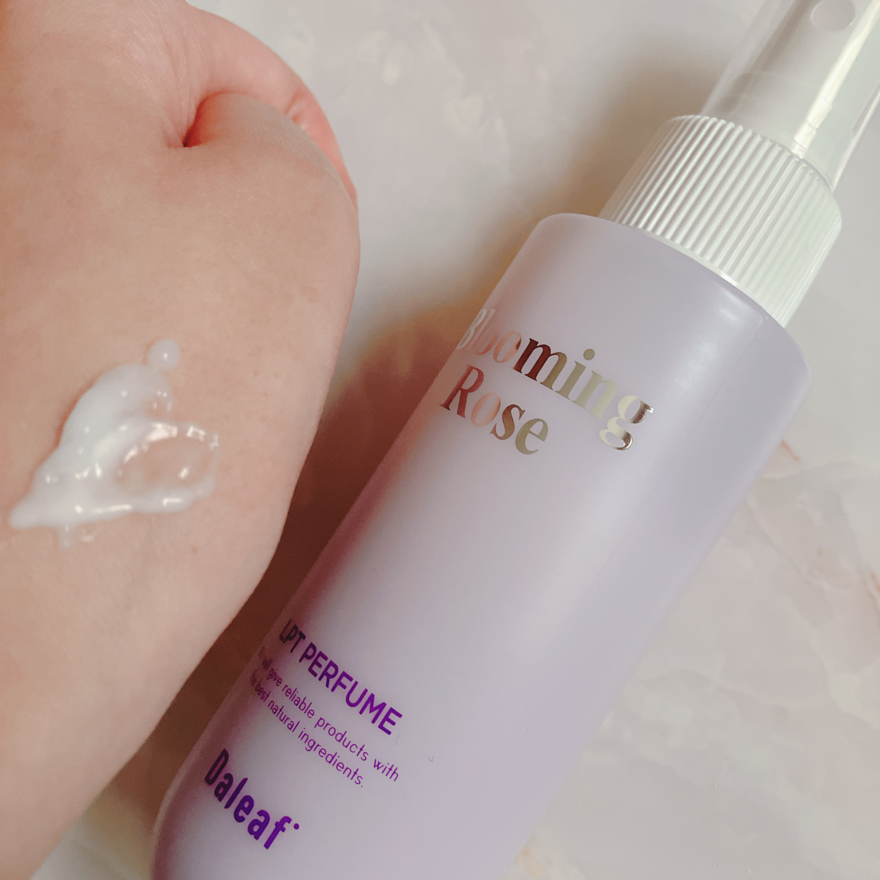 吹きかけた瞬間に香りが広がる「パフュームヘアパックインミスト」 吹きかけるだけ簡単な洗い流さないヘアトリートメントです。 サロントリートメント製品に使われる、低分⼦タンパク質(LPP)と⾼分⼦タンパク質(PPT) の2重タンパク質が配合されています。 ミストとクリームの2つのタイプがあり、潤い重視の場合はミストを、ダメージケアにはクリームを、2つのタイプから選んで使用することができます。 ブルーミングローズはトップがベルガモットエッセンス、ミドルがダマスクローズエッセンスとピオニー、ベースがホワイトムスクのいい香りです◎