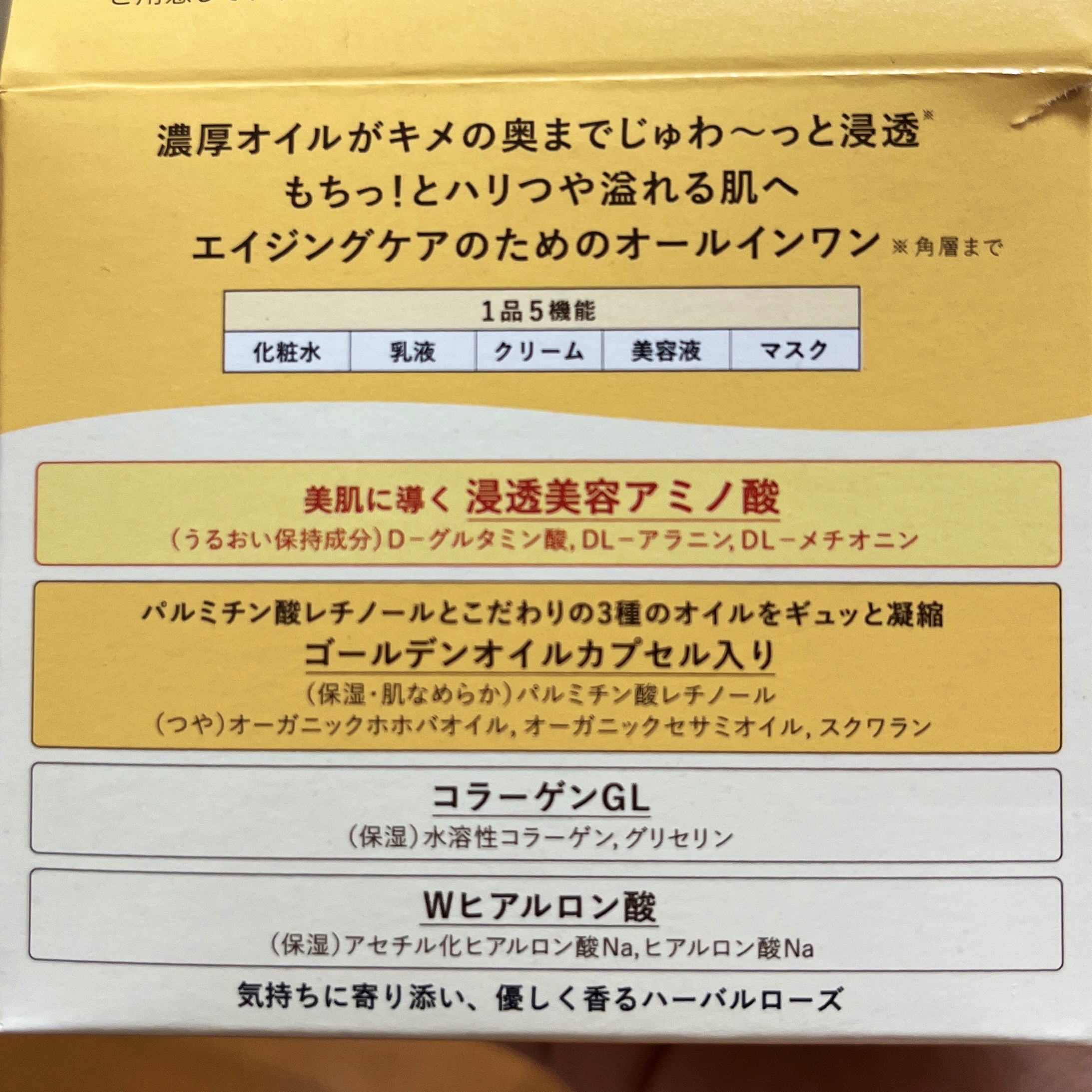 パルミチン酸レチノール*1と3種のオイル*2をギュッと凝縮したゴールデンオイルカプセルや、美肌に導く浸透美容アミノ酸*3も配合 1品5機能(化粧水・乳液・クリーム・美容液・マスク) ぷるんとしたジェルテクスチャー。見た目にも綺麗なオイルのカプセルが入ってます。