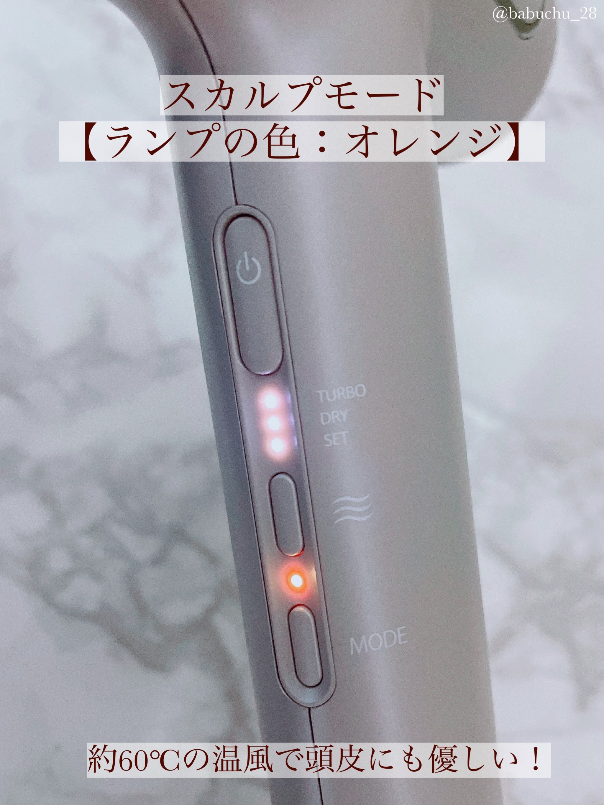270gというかなり軽量なドライヤー! なので腕が疲れにくく快適✨ こんな軽いのに風量がかなり強くてびっくり😳 このドライヤーはとにかく風量が強め! 最後まで乾かしやすい! モードは4つあり ①スピードで髪全体を乾かして ②スカルプで頭皮と地肌をしっかり乾かし ③ツヤで整えて ④クールダウンでキューティクルを引き締める✨
