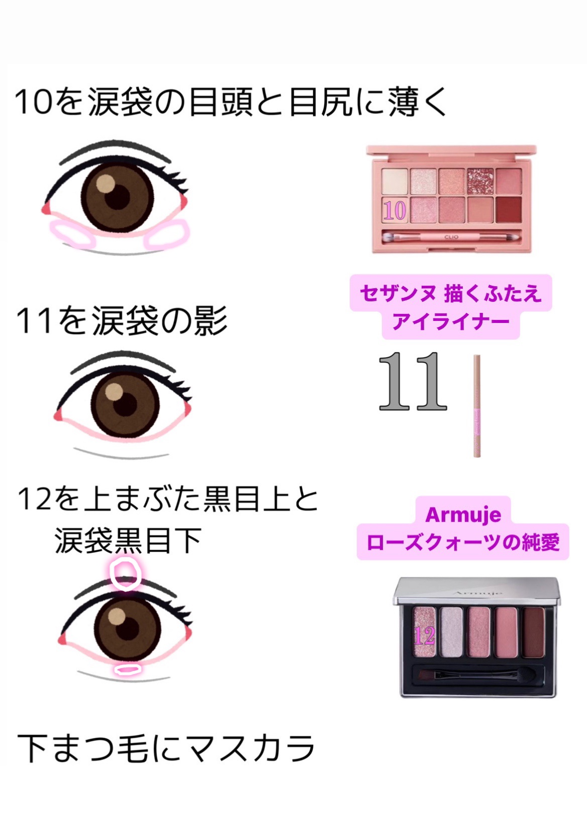 全てdasique04①真ん中をアイホール全体と涙袋に広め②ビューラーして黒マスカラ③ザセムブライトナーを涙袋④右上を涙袋⑤左下を地雷ライン⑥真ん中の段左を上まぶた黒目上と涙袋⑦涙袋ライナーを涙袋の影⑧アイライナーをひく...