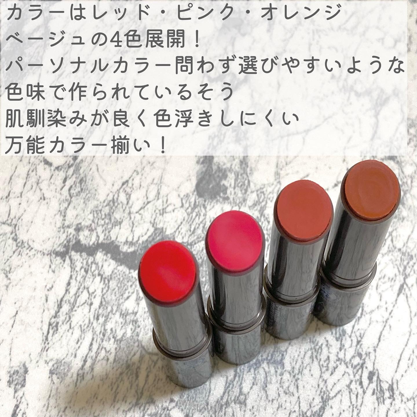 - ※商品パッケージは予告なく変更する場合がありますのでご了承ください。 ウォーターティント処方を採用。 唇の水分に反応し、発色が長続きする色つきリップです。 UVカット(SPF26、PA+++)。無香料。