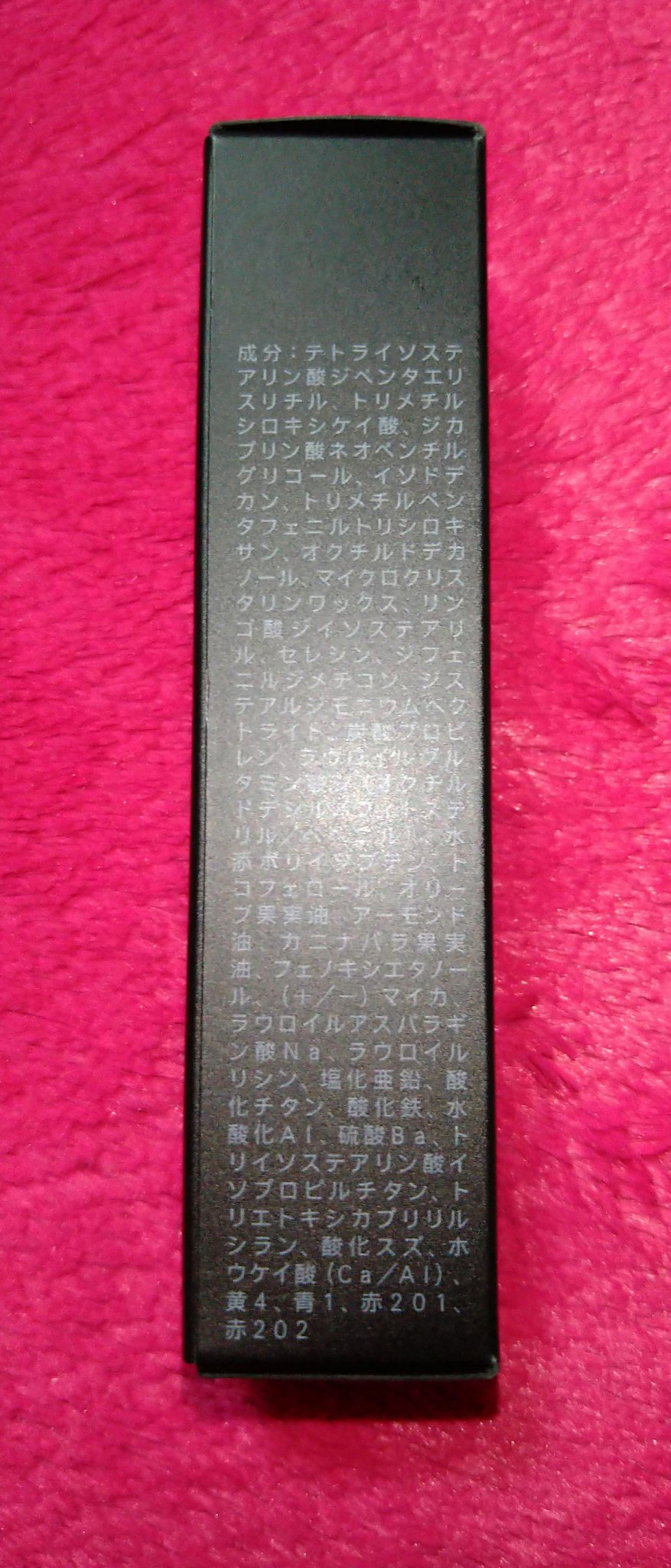 - <01 夕奏 -YUUKANADE> 水添ポリイソブテン、デカイソステアリン酸ポリグリセリル-10、トリ(カプリル酸/カプリン酸)グリセリル、ラウロイルグルタミン酸ジ(オクチルドデシル/フィトステリル/ベヘニル)、ダイマージリノール酸(フィトステリル/イソステアリル/セチル/ステアリル/ベヘニル)、オクチルドデカノール、ラウロイルグルタミン酸ジ(フィトステリル/オクチルドデシル)、パラフィン、トリポリヒドロキシステアリン酸ジペンタエリスリチル、合成ワックス、マイクロクリスタリンワックス、水添マイクロクリスタリンワックス、ヒドロキシステアリン酸エチルヘキシル、トコフェロール、ブドウ種子油、アンズ核油、カニナバラ果実油、(エチレン/プロピレン)コポリマー、ポリエチレン、(+/−)グンジョウ、シリカ、ラウロイルリシン、金、酸化チタン、酸化鉄、硫酸Ba、銀、酸化スズ、ホウケイ酸(Ca/Al)、合成フルオロフロゴパイト、黄4、黄5、赤104(1)、赤201、赤202 <02 花紅 -HANAKURENAI> 水添ポリイソブテン、デカイソステアリン酸ポリグリセリル-10、トリ(カプリル酸/カプリン酸)グリセリル、ラウロイルグルタミン酸ジ(オクチルドデシル/フィトステリル/ベヘニル)、ダイマージリノール酸(フィトステリル/イソステアリル/セチル/ステアリル/ベヘニル)、オクチルドデカノール、ラウロイルグルタミン酸ジ(フィトステリル/オクチルドデシル)、パラフィン、トリポリヒドロキシステアリン酸ジペンタエリスリチル、合成ワックス、マイクロクリスタリンワックス、水添マイクロクリスタリンワックス、ヒドロキシステアリン酸エチルヘキシル、トコフェロール、ブドウ種子油、アンズ核油、カニナバラ果実油、(エチレン/プロピレン)コポリマー、ポリエチレン、(+/−)グンジョウ、シリカ、ラウロイルリシン、金、酸化チタン、酸化鉄、硫酸Ba、銀、酸化スズ、ホウケイ酸(Ca/Al)、合成フルオロフロゴパイト、黄4、黄5、赤104(1)、赤201、赤202 <03 陽紅 -HIBENI> 水添ポリイソブテン、デカイソステアリン酸ポリグリセリル-10、トリ(カプリル酸/カプリン酸)グリセリル、ラウロイルグルタミン酸ジ(オクチルドデシル/フィトステリル/ベヘニル)、ダイマージリノール酸(フィトステリル/イソステアリル/セチル/ステアリル/ベヘニル)、オクチルドデカノール、ラウロイルグルタミン酸ジ(フィトステリル/オクチルドデシル)、パラフィン、トリポリヒドロキシステアリン酸ジペンタエリスリチル、合成ワックス、マイクロクリスタリンワックス、水添マイクロクリスタリンワックス、ヒドロキシステアリン酸エチルヘキシル、トコフェロール、ブドウ種子油、アンズ核油、カニナバラ果実油、(エチレン/プロピレン)コポリマー、ポリエチレン、(+/−)グンジョウ、シリカ、ラウロイルリシン、金、酸化チタン、酸化鉄、硫酸Ba、銀、酸化スズ、ホウケイ酸(Ca/Al)、合成フルオロフロゴパイト、黄4、黄5、赤104(1)、赤201、赤202 <04 金杏 -KINANZU> 水添ポリイソブテン、デカイソステアリン酸ポリグリセリル-10、トリ(カプリル酸/カプリン酸)グリセリル、ラウロイルグルタミン酸ジ(オクチルドデシル/フィトステリル/ベヘニル)、ダイマージリノール酸(フィトステリル/イソステアリル/セチル/ステアリル/ベヘニル)、オクチルドデカノール、ラウロイルグルタミン酸ジ(フィトステリル/オクチルドデシル)、パラフィン、トリポリヒドロキシステアリン酸ジペンタエリスリチル、合成ワックス、マイクロクリスタリンワックス、水添マイクロクリスタリンワックス、ヒドロキシステアリン酸エチルヘキシル、トコフェロール、ブドウ種子油、アンズ核油、カニナバラ果実油、(エチレン/プロピレン)コポリマー、ポリエチレン、(+/−)グンジョウ、シリカ、ラウロイルリシン、金、酸化チタン、酸化鉄、硫酸Ba、銀、酸化スズ、ホウケイ酸(Ca/Al)、合成フルオロフロゴパイト、黄4、黄5、赤104(1)、赤201、赤202 <05 恍華 -HIKARIBANA> 水添ポリイソブテン、デカイソステアリン酸ポリグリセリル-10、トリ(カプリル酸/カプリン酸)グリセリル、ラウロイルグルタミン酸ジ(オクチルドデシル/フィトステリル/ベヘニル)、ダイマージリノール酸(フィトステリル/イソステアリル/セチル/ステアリル/ベヘニル)、オクチルドデカノール、ラウロイルグルタミン酸ジ(フィトステリル/オクチルドデシル)、パラフィン、トリポリヒドロキシステアリン酸ジペンタエリスリチル、合成ワックス、マイクロクリスタリンワックス、水添マイクロクリスタリンワックス、ヒドロキシステアリン酸エチルヘキシル、トコフェロール、ブドウ種子油、アンズ核油、カニナバラ果実油、(エチレン/プロピレン)コポリマー、ポリエチレン、(+/−)グンジョウ、シリカ、ラウロイルリシン、金、酸化チタン、酸化鉄、硫酸Ba、銀、酸化スズ、ホウケイ酸(Ca/Al)、合成フルオロフロゴパイト、黄4、黄5、赤104(1)、赤201、赤202 <06 鮮絢華 -SENKENKA> 水添ポリイソブテン、デカイソステアリン酸ポリグリセリル-10、トリ(カプリル酸/カプリ