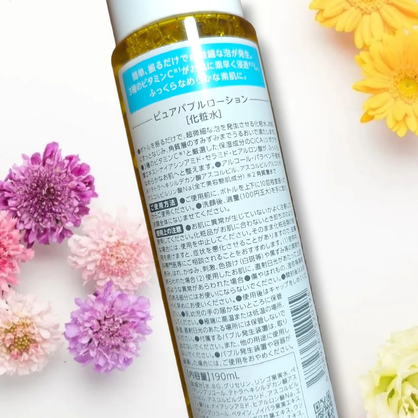 - <190ml> 水、ペンチレングリコール、BG、グリセリン、ヒアルロン酸Na、フェノキシエタノール、ノイバラ果実エキス、セラミドNG、エチルヘキシルグリセリン、ヒドロキシエチルセルロース、クエン酸、セラミドNP、ベタイン、セラミドAP、テトラヘキシルデカン酸アスコルビル、アスコルビルグルコシド、ペンテト酸5Na、ポリソルベート20、アスコルビルリン酸Na、クエン酸Na、ウンシュウミカン果皮エキス、アーチチョーク葉エキス、ナイアシンアミド、エトキシジグリコール、ツボクサ葉エキス、ワイルドタイムエキス、グリセレス-26、リンゴ果実水