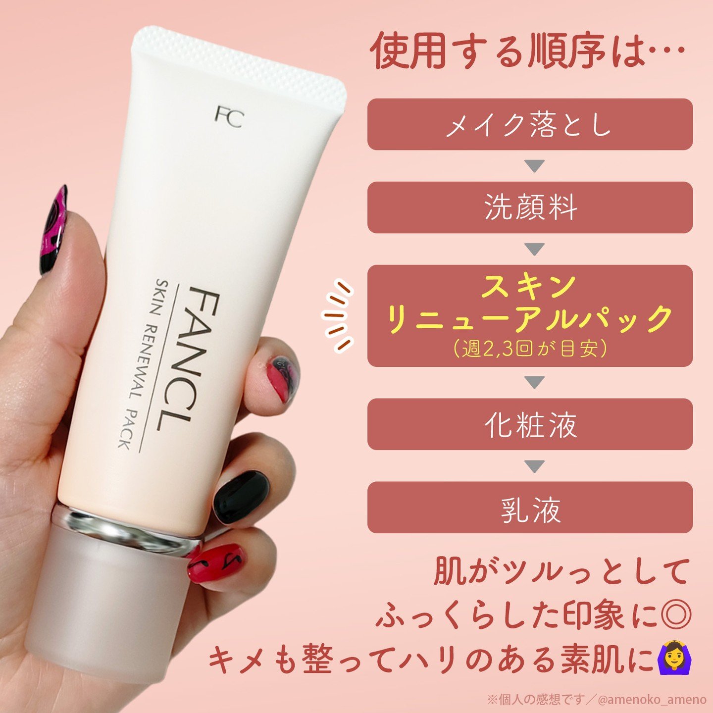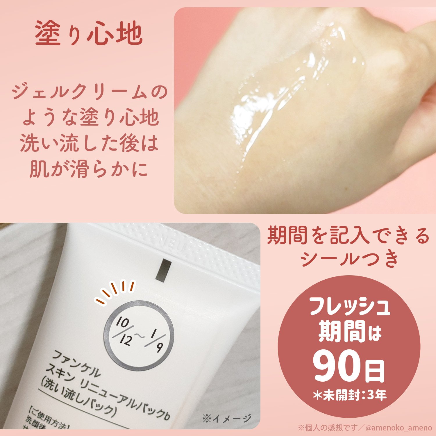 洗顔後の肌に馴染ませて5分パック!古い角質や汚れを取り除き、つるんと柔らかく明るい印象の肌に☆☆☆ねっとりとした重めのテクスチャー。するんと肌に伸ばせて、液垂れしてこないので扱いやすいです◎お風呂に入って洗顔後「スキンリニューアルパック」を塗...