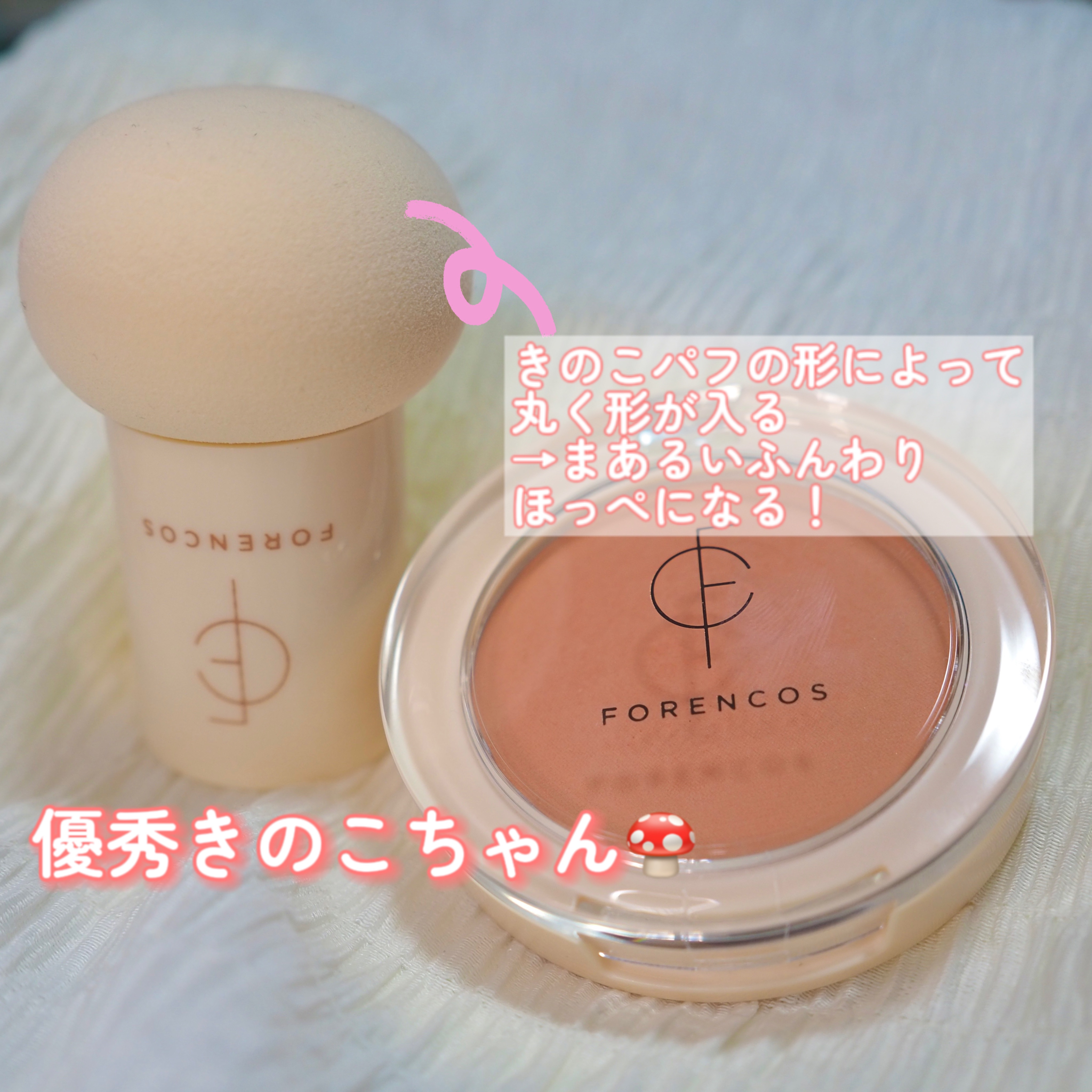 簡単に可愛いほっぺを作れるチーク!フォレンコスピュアブラッシャーパフ付き¥1,980このチークはチークと一緒にきのこ型のパフがついてきてそれを使って簡単に可愛いほっぺたを作れるチークです!04エンジェル肌なじみの良いベージュカラーです。肌に馴...