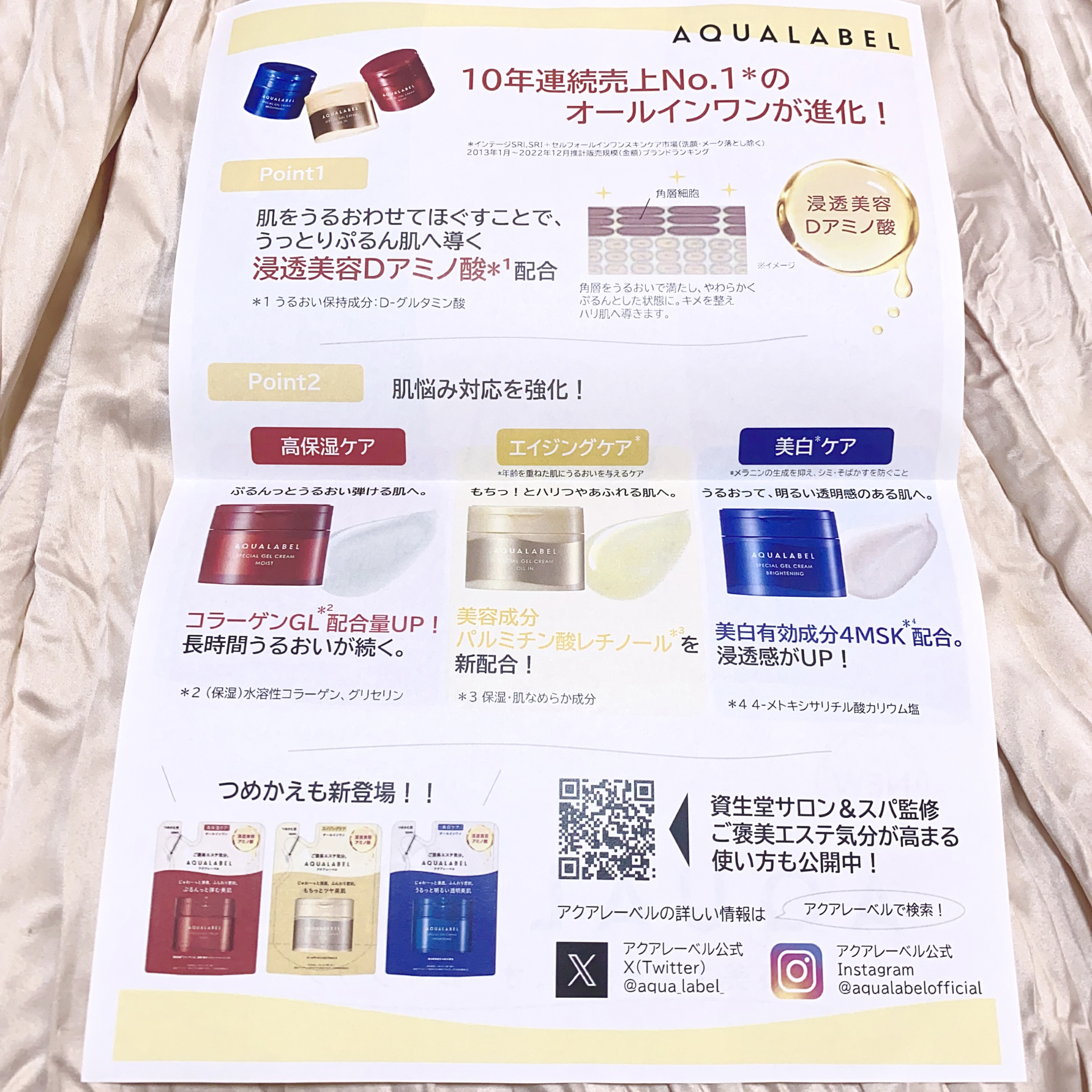 - ①資生堂のアミノ酸研究の集大成である10年連続売上No.1※のアクアレーベルがリニューアル ※1インテージSRl,SRI+セルフオールインワンスキンケア市場(洗顔・メーク落とし除く)2013年1月~2022年12月推計販売規模(金額)ブランドランキング ②浸透美容Dアミノ酸※2配合。肌をうるおいほぐして、うっとりぷるん肌へ 新アクアレーベルには、シリーズのキー成分「浸透美容Dアミノ酸」を配合。 柔軟・浸透・密封を叶える「トリプルエフェクト処方」で使うたびに心地よく、ご褒美エステ気分にしてくれます。 資生堂の最新研究から、「浸透美容Dアミノ酸」を含むアクアレーベル共通成分※3に新たに角層をほぐす働きを発見、柔らかくうるおい密度の高い肌へと導きます。 ※2(うるおい保持成分)D-グルタミン酸 ※3 DL- アラニン、DL-メチオニン、グリセリン ③肌悩みに合わせて選べる3種類 アクアレーベルのオールインワンは、美肌に導く「浸透美容Dアミノ酸※2」を配合。1品5機能※4のスペシャルケアで、使うたびに心地よく、まるでご褒美エステ気分を味わうことができます。 肌状態に合わせて選べる3つのラインナップ ■アクアレーベル スペシャルジェルクリーム EX (モイスト) 配合量UP!コラーゲンGL※5配合の弾力ジェルが、じゅわ~っと浸透※6、ふんわり密封。ぷるんっ!とうるおい弾ける肌へ導く、高保湿ケアのためのオールインワン。 ■アクアレーベル スペシャルジェルクリーム EX (ブライトニング)(医薬部外品) 販売名:アクアレーベル ブライトニング ジェルクリーム EX 美白有効成分4MSK※7配合の濃密ジェルクリームがじゅわ~っと浸透※6、ふんわり密封。濃密なジェルクリームがみずみずしい感触に変化し、浸透感UP。うるおって明るく透明感のある肌へ導く、美白※8ケアのためのオールインワン。 ■アクアレーベル スペシャルジェルクリーム EX (オイルイン) パルミチン酸レチノール(保湿・肌なめらか)を新配合!濃厚オイルがじゅわ~っと浸透※6、ふんわり密封。もちっ!とハリつや溢れる肌へ導く、エイジングケア※9のためのオールインワン。 ※4 化粧水、乳液、クリーム、美容液、マスク ※5 (保湿)水溶性コラーゲン、グリセリン ※6 角層まで ※7 4-メトキシサリチル酸カリウム塩 ※8 メラニンの生成を抑え、シミ・ソバカスを防ぐこと ※9 年齢に応じたうるおいケア