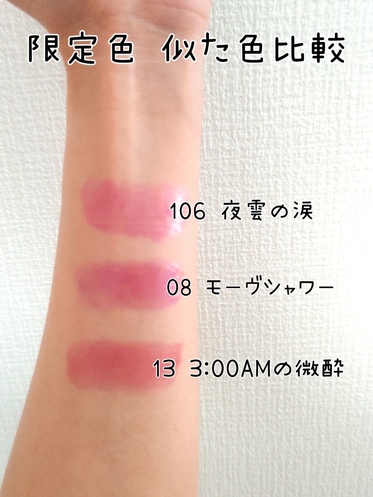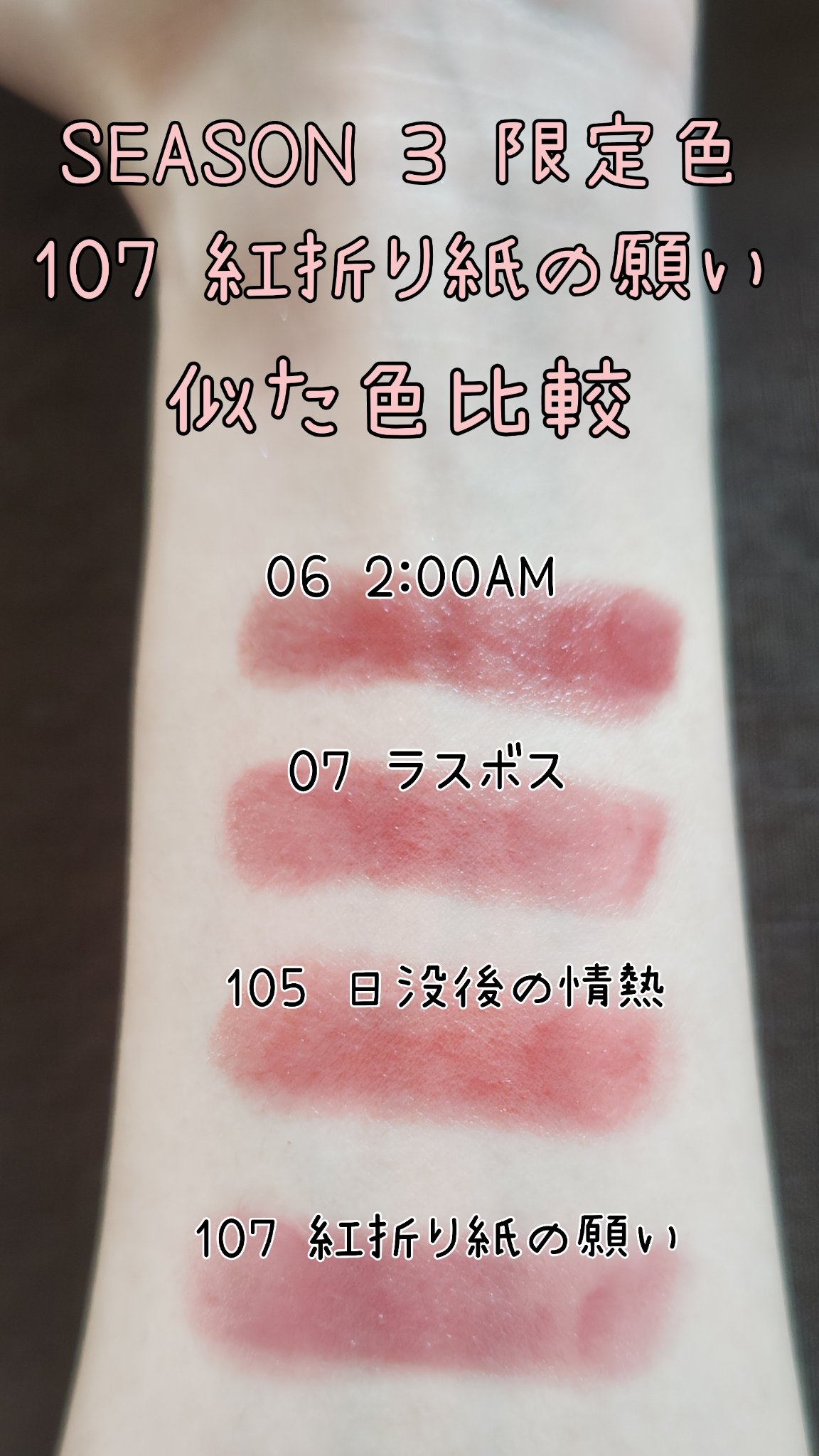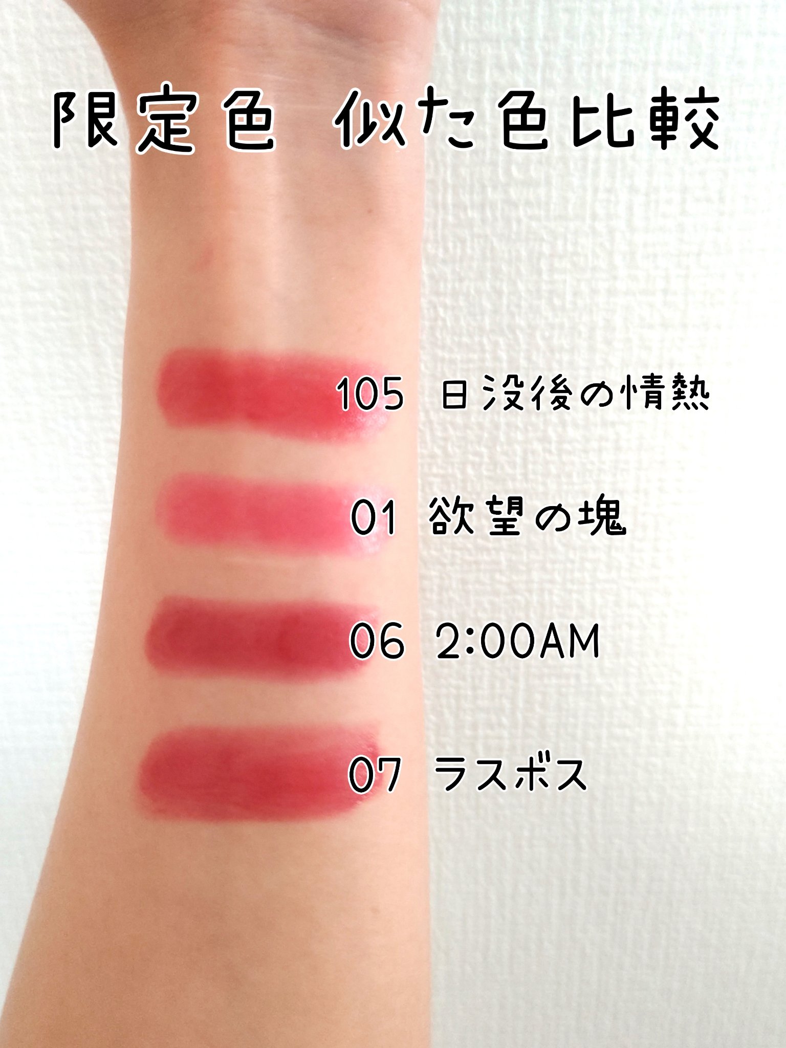 01 欲望の塊明るめ青みピンクレッド。レッドよりもパキッとした深めのピンクと言った方が伝わるかな…?青みが強いのでイエベさんだと扱いづらいかも。ピンクだけど子供っぽくなりすぎない。ティントみたいな青みが好きな人には多分刺さる。 05 ダークフィグくすみ系ブラウンレッド(モーヴ感あり)。ベージュっぽいけど紫みが入っているのでブルベのブラウンリップとして優秀。こっくりと落ち着いていて秋冬っぽいイメージのある色味。 06 2:00AMシアー感のあるディープレッド。ブルベ冬に推したい赤リップ。鮮やかだけどとても使いやすい。重ね方次第でオンでもオフでもいける。