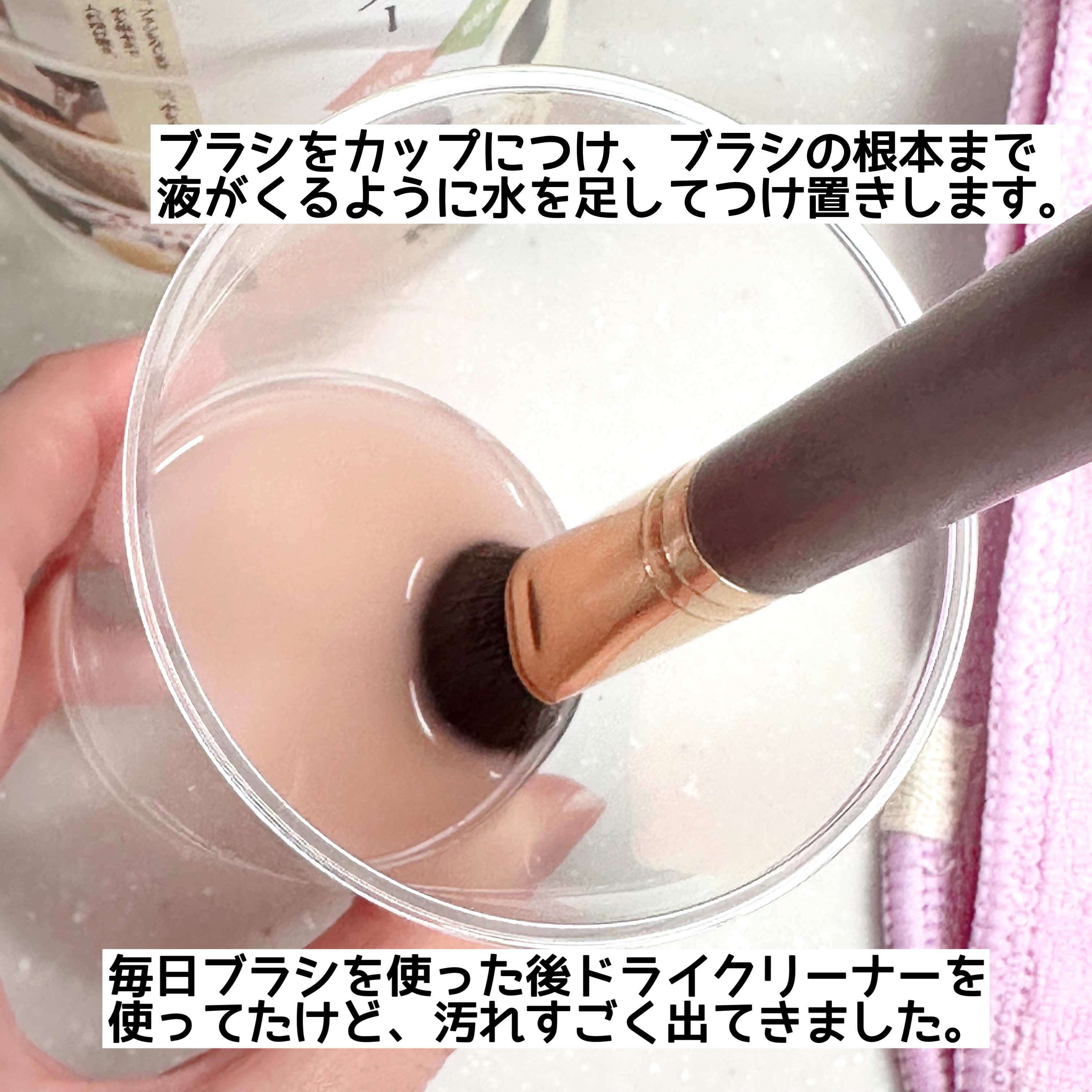 熊野筆リセッターは単なる洗浄液ではなく、メイクブラシ本来のふっわふっわ感がよみがえる魔法の液なの🪄︎︎✨ 洗ってるうちに液がどんどん濁ってきて、わたしこんなに汚れた筆で毎日メイクしてたんだってひいてしまった🥹 乾燥させたあとの筆は正にふっわふっわで新品みたいによみがえってすごいと思ったよ👏