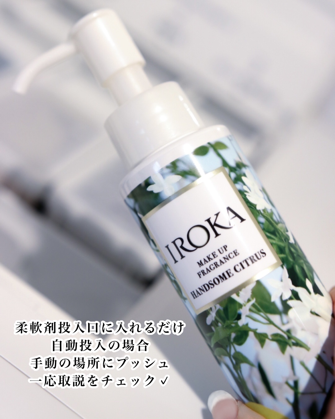 - 【洗たく用香りづけ剤】 <柔軟剤と一緒に入れて、上質をまとう 香水エッセンス> IROKAこだわりの厳選香料を贅沢*1に配合。 いつもの柔軟剤と一緒に入れるだけで、まるで香水のように上質な香りへ。 その特別な香りは、あなたを優雅で洗練された印象へと誘う。 *1 花王柔軟剤との比較 計量いらずのプッシュタイプで使いやすく、香りの好みに合わせてプッシュ回数を調整してお楽しみ頂けます。 <柔軟剤との組み合わせ自由> 香料を厳選した3つの香水エッセンス ◆フェム・バニラ:甘くフェミニンな香りをプラス(柔らかく温かみのあるバニラがふんわりと奥深く漂う香り) ◆センシュアル・アンバー:艶やかな大人の香りをプラス(上質なアンバーを贅沢に使った 艶やかで洗練された香り) ◆ハンサム・シトラス:凛とした爽やかな香りをプラス(ベルガモットにジンジャーリリーの深みを加えた 上品で爽やかな香り) ●香料厳選 ●上質な香り続く ●計量いらず プッシュタイプ(約110プッシュ分) ●液体だから溶け残りなし ●収納しやすいコンパクトな容器 ※23年10月パッケージリニューアル