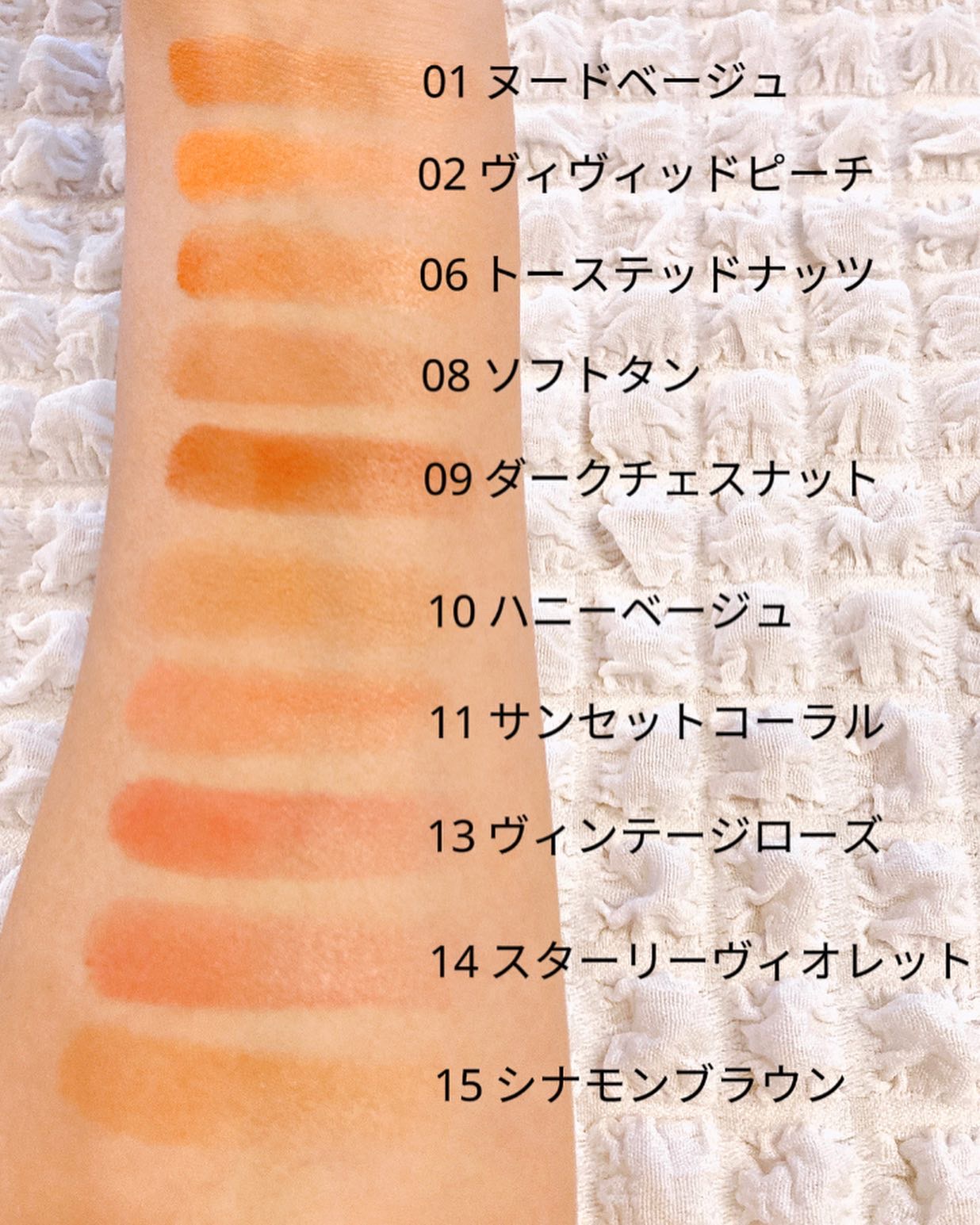 - ヌードベージュ タルク、テトライソステアリン酸ペンタエリスリチル、シクロペンタシロキサン、シリカ、ナイロン-12、酸化亜鉛、ステアリン酸Mg、ワセリン、ジメチコノール、フェノキシエタノール、エチルヘキシルグリセリン、マイカ、酸化チタン、酸化鉄、赤226、酸化スズ ヴィヴィッドピーチ タルク、マイカ、酸化亜鉛、テトライソステアリン酸ペンタエリスリチル、シリカ、ナイロン-12、シクロペンタシロキサン、ステアリン酸Mg、ワセリン、ジメチコノール、フェノキシエタノール、エチルヘキシルグリセリン、酸化チタン、赤226、黄5、酸化鉄、赤202、酸化スズ ロージーピンク タルク、マイカ、テトライソステアリン酸ペンタエリスリチル、シリカ、シクロペンタシロキサン、ナイロン-12、ワセリン、ステアリン酸Mg、ジメチコノール、フェノキシエタノール、エチルヘキシルグリセリン、酸化亜鉛、酸化スズ、酸化チタン、赤226、酸化鉄、黄5、赤202、赤104(1) ダスティローズ タルク、マイカ、酸化亜鉛、テトライソステアリン酸ペンタエリスリチル、シリカ、ナイロン-12、シクロペンタシロキサン、ステアリン酸Mg、ワセリン、ジメチコノール、フェノキシエタノール、エチルヘキシルグリセリン、酸化鉄、赤226、酸化チタン、赤202 ポッピーワイン タルク、マイカ、酸化亜鉛、テトライソステアリン酸ペンタエリスリチル、シリカ、ナイロン-12、シクロペンタシロキサン、ステアリン酸Mg、ワセリン、ジメチコノール、フェノキシエタノール、エチルヘキシルグリセリン、酸化鉄、黄5、赤202、酸化チタン トーステッドナッツ タルク、テトライソステアリン酸ペンタエリスリチル、シクロペンタシロキサン、シリカ、ナイロン-12、酸化亜鉛、ステアリン酸Mg、ワセリン、ジメチコノール、フェノキシエタノール、エチルヘキシルグリセリン、マイカ、酸化チタン、酸化鉄、赤226、赤202、酸化スズ ライトアプリコット タルク、マイカ、テトライソステアリン酸ペンタエリスリチル、シリカ、ナイロン-12、シクロペンタシロキサン、ワセリン、ステアリン酸Mg、ジメチコノール、フェノキシエタノール、エチルヘキシルグリセリン、酸化亜鉛、酸化チタン、酸化鉄、赤226、黄5、酸化スズ ソフトタン タルク、マイカ、シリカ、ナイロン-12、テトライソステアリン酸ペンタエリスリチル、シクロペンタシロキサン、ステアリン酸Mg、ワセリン、ジメチコノール、フェノキシエタノール、エチルヘキシルグリセリン、酸化亜鉛、酸化鉄、赤226 ダークチェスナット タルク、マイカ、ナイロン-12、イソドデカン、フェニルトリメチコン、テトライソステアリン酸ペンタエリスリチル、ワセリン、ジメチコノール、シクロペンタシロキサン、トリメチルシロキシケイ酸、フェノキシエタノール、エチルヘキシルグリセリン、酸化鉄、黄5、赤226、赤202 ハニーベージュ タルク、マイカ、シリカ、ナイロン-12、テトライソステアリン酸ペンタエリスリチル、シクロペンタシロキサン、ステアリン酸Mg、ワセリン、ジメチコノール、フェノキシエタノール、エチルヘキシルグリセリン、酸化チタン、酸化鉄、赤226、酸化スズ サンセットコーラル タルク、シリカ、テトライソステアリン酸ペンタエリスリチル、ナイロン-12、シクロペンタシロキサン、マイカ、ステアリン酸Mg、ワセリン、ジメチコノール、フェノキシエタノール、エチルヘキシルグリセリン、酸化鉄、酸化チタン、赤226、赤202、酸化スズ メイプルブラウン タルク、マイカ、シリカ、テトライソステアリン酸ペンタエリスリチル、ナイロン-12、シクロペンタシロキサン、ステアリン酸Mg、ワセリン、ジメチコノール、フェノキシエタノール、エチルヘキシルグリセリン、酸化鉄、黄5、赤226、赤202 ヴィンテージローズ タルク、マイカ、シリカ、テトライソステアリン酸ペンタエリスリチル、ナイロン-12、シクロペンタシロキサン、ワセリン、ステアリン酸Mg、ジメチコノール、フェノキシエタノール、エチルヘキシルグリセリン、酸化鉄、赤226、赤202、黄5 スターリーヴァイオレット マイカ、タルク、テトライソステアリン酸ペンタエリスリチル、シリカ、シクロペンタシロキサン、ナイロン-12、ワセリン、ジメチコノール、ステアリン酸Mg、フェノキシエタノール、エチルヘキシルグリセリン、酸化スズ、酸化チタン、酸化鉄、赤226、赤202 シナモンブラウン タルク、マイカ、シリカ、テトライソステアリン酸ペンタエリスリチル、ナイロン-12、シクロペンタシロキサン、ステアリン酸Mg、ワセリン、ジメチコノール、フェノキシエタノール、エチルヘキシルグリセリン、黄4、酸化チタン、酸化鉄、黄5