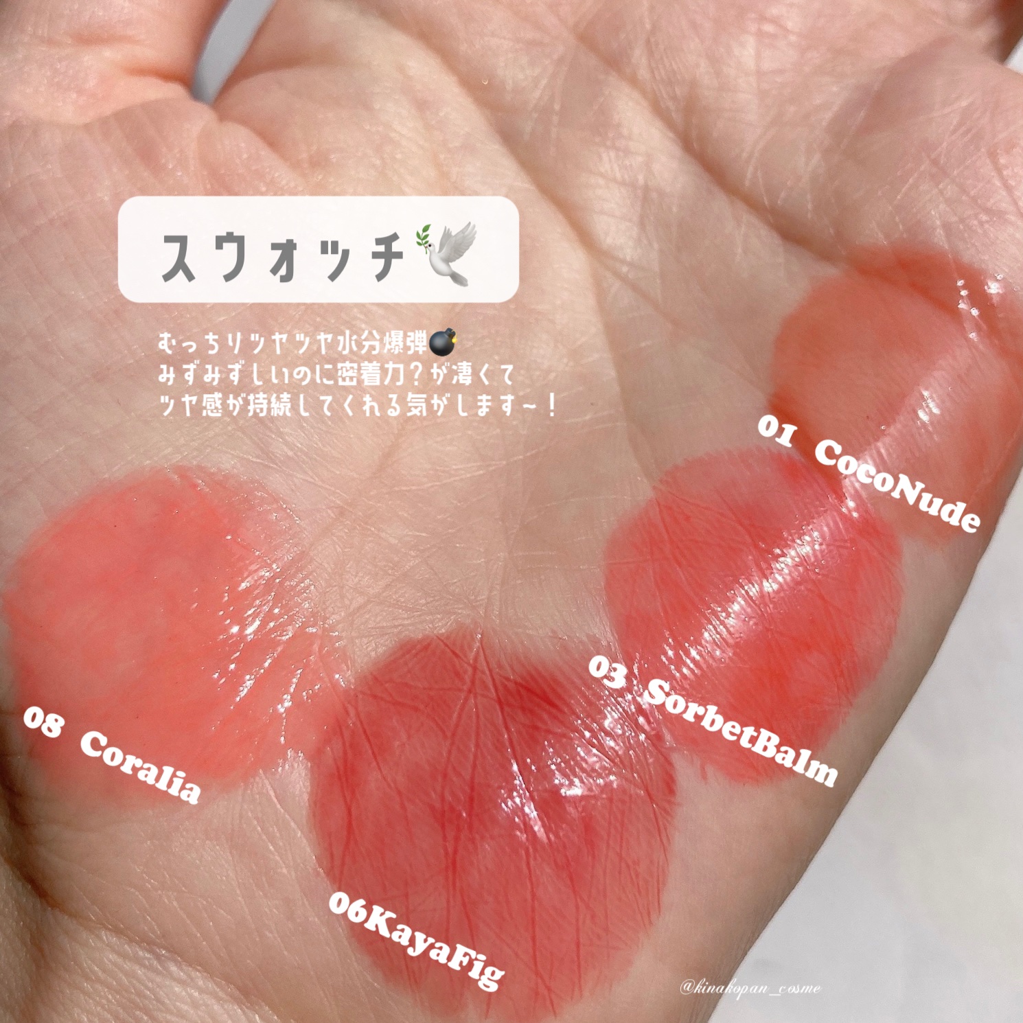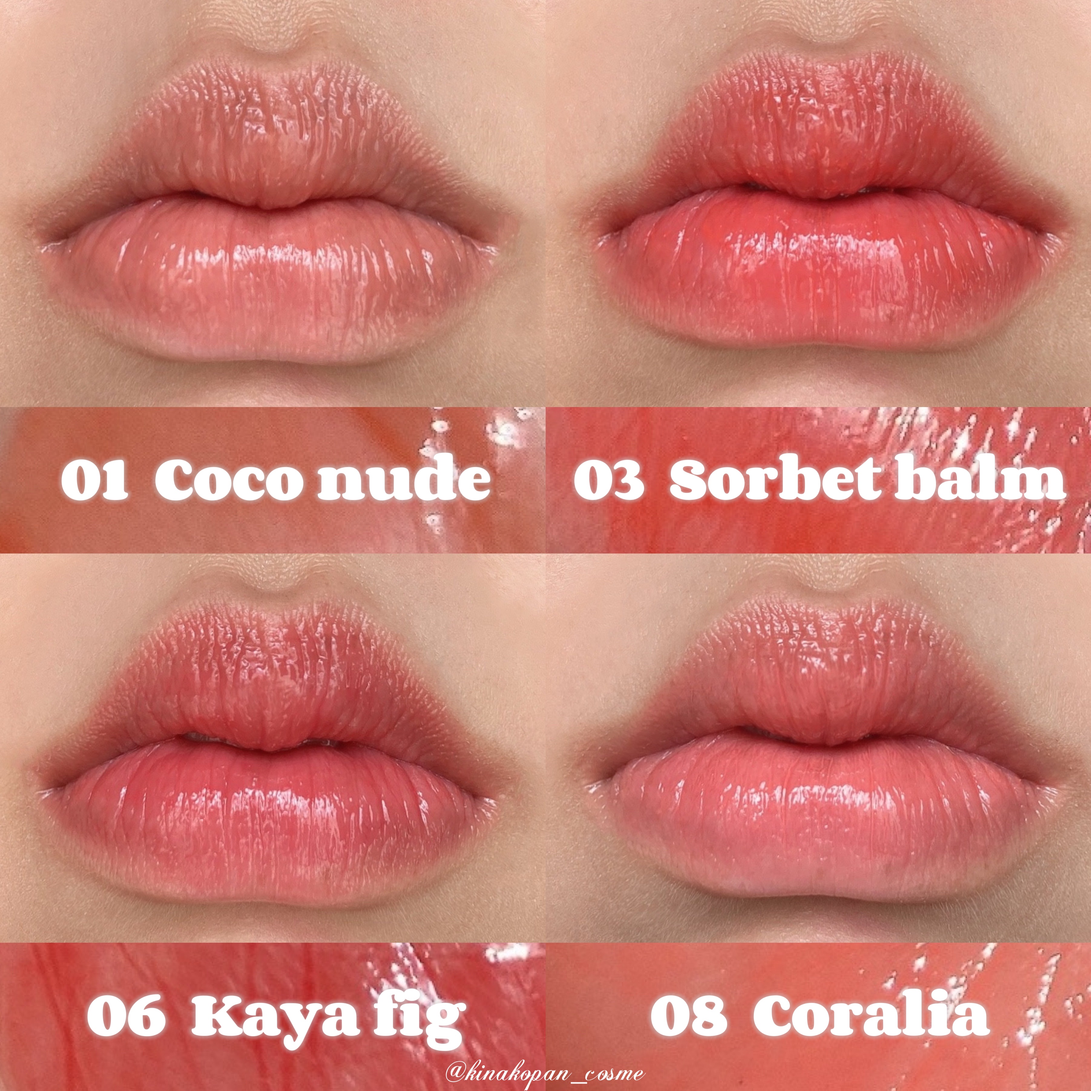 - <01 ココヌード(Coco Nude)> リンゴ酸ジイソステアリル、ダイマージリノール酸ダイマージリノレイルビス(ベヘニル/イソステアリル/フィトステリル)、トリイソステアリン酸ポリグリセリル-2、ビスジグリセリルポリアシルアジペート-2、パラフィン、トリメリト酸トリトリデシル、テトライソステアリン酸ペンタエリスリチル、マイクロクリスタリンワックス、イソステアリン酸ソルビタン、1,2-ヘキサンジオール、ジステアルジモニウムヘクトライト、合成ワックス、酸化チタン、(エチレン/プロピレン)コポリマー、酸化鉄、炭酸プロピレン、香料、赤104(1)、リモネン、リナロール、ホホバ種子油、アーモンド油、アンズ核油、月見草油、オリーブ果実油、アルガニアスピノサ核油、シア脂、ツバキ種子油、トリ(カプリル/カプリン酸)グリセリル、マンゴー果実エキス、カニナバラ果実エキス <02 ラヴィーピンク(Lovey Pink)> リンゴ酸ジイソステアリル、ダイマージリノール酸ダイマージリノレイルビス(ベヘニル/イソステアリル/フィトステリル)、トリイソステアリン酸ポリグリセリル-2、ビスジグリセリルポリアシルアジペート-2、パラフィン、トリメリト酸トリトリデシル、テトライソステアリン酸ペンタエリスリチル、マイクロクリスタリンワックス、イソステアリン酸ソルビタン、1,2-ヘキサンジオール、ジステアルジモニウムヘクトライト、合成ワックス、酸化チタン、(エチレン/プロピレン)コポリマー、赤104(1)、黄5、炭酸プロピレン、赤202、香料、リモネン、リナロール、ホホバ種子油、アーモンド油、アンズ核油、月見草油、オリーブ果実油、アルガニアスピノサ核油、シア脂、ツバキ種子油、トリ(カプリル/カプリン酸)グリセリル、マンゴー果実エキス、カニナバラ果実エキス <03 ソルベバーム(Sorbet Balm)> リンゴ酸ジイソステアリル、ダイマージリノール酸ダイマージリノレイルビス(ベヘニル/イソステアリル/フィトステリル)、トリイソステアリン酸ポリグリセリル-2、ビスジグリセリルポリアシルアジペート-2、パラフィン、トリメリト酸トリトリデシル、テトライソステアリン酸ペンタエリスリチル、マイクロクリスタリンワックス、イソステアリン酸ソルビタン、1,2-ヘキサンジオール、ジステアルジモニウムヘクトライト、合成ワックス、酸化チタン、赤104(1)、(エチレン/プロピレン)コポリマー、酸化鉄、黄5、炭酸プロピレン、香料、リモネン、リナロール、アルガニアスピノサ核油、シア脂、ツバキ種子油、トリ(カプリル/カプリン酸)グリセリル、アーモンド油、アンズ核油、月見草油、オリーブ果実油、ホホバ種子油、マンゴー果実エキス、カニナバラ果実エキス <04 ヒッピーベリー(Hippie Berry)> リンゴ酸ジイソステアリル、ダイマージリノール酸ダイマージリノレイルビス(ベヘニル/イソステアリル/フィトステリル)、トリイソステアリン酸ポリグリセリル-2、ビスジグリセリルポリアシルアジペート-2、パラフィン、トリメリト酸トリトリデシル、テトライソステアリン酸ペンタエリスリチル、マイクロクリスタリンワックス、イソステアリン酸ソルビタン、1,2-ヘキサンジオール、ジステアルジモニウムヘクトライト、合成ワックス、赤104(1)、黄5、(エチレン/プロピレン)コポリマー、赤202、炭酸プロピレン、酸化鉄、酸化チタン、香料、リモネン、リナロール、ホホバ種子油、アーモンド油、アンズ核油、月見草油、オリーブ果実油、アルガニアスピノサ核油、シア脂、ツバキ種子油、トリ(カプリル/カプリン酸)グリセリル、カニナバラ果実エキス、マンゴー果実エキス <05 ヌガーサンド(Nougat Sand)> リンゴ酸ジイソステアリル、ダイマージリノール酸ダイマージリノレイルビス(ベヘニル/イソステアリル/フィトステリル)、トリイソステアリン酸ポリグリセリル-2、ビスジグリセリルポリアシルアジペート-2、パラフィン、トリメリト酸トリトリデシル、テトライソステアリン酸ペンタエリスリチル、マイクロクリスタリンワックス、イソステアリン酸ソルビタン、酸化チタン、1,2-ヘキサンジオール、ジステアルジモニウムヘクトライト、合成ワックス、黄4、(エチレン/プロピレン)コポリマー、酸化鉄、炭酸プロピレン、赤202、香料、リモネン、青1、リナロール、シア脂、ツバキ種子油、トリ(カプリル/カプリン酸)グリセリル、アルガニアスピノサ核油、ホホバ種子油、アーモンド油、アンズ核油、月見草油、オリーブ果実油、マンゴー果実エキス、カニナバラ果実エキス <06 カヤフィグ(Kaya Fig)> リンゴ酸ジイソステアリル、ダイマージリノール酸ダイマージリノレイルビス(ベヘニル/イソステアリル/フィトステリル)、トリイソステアリン酸ポリグリセリル-2、ビスジグリセリルポリアシルアジペート-2、パラフィン、トリメリト酸トリトリデシル、テトライソステアリン酸ペンタエリスリチル、マイクロクリスタリンワックス、イソステアリン酸ソルビタン、1,2-ヘキサンジオール、酸化チタン、ジステアルジモニウムヘク