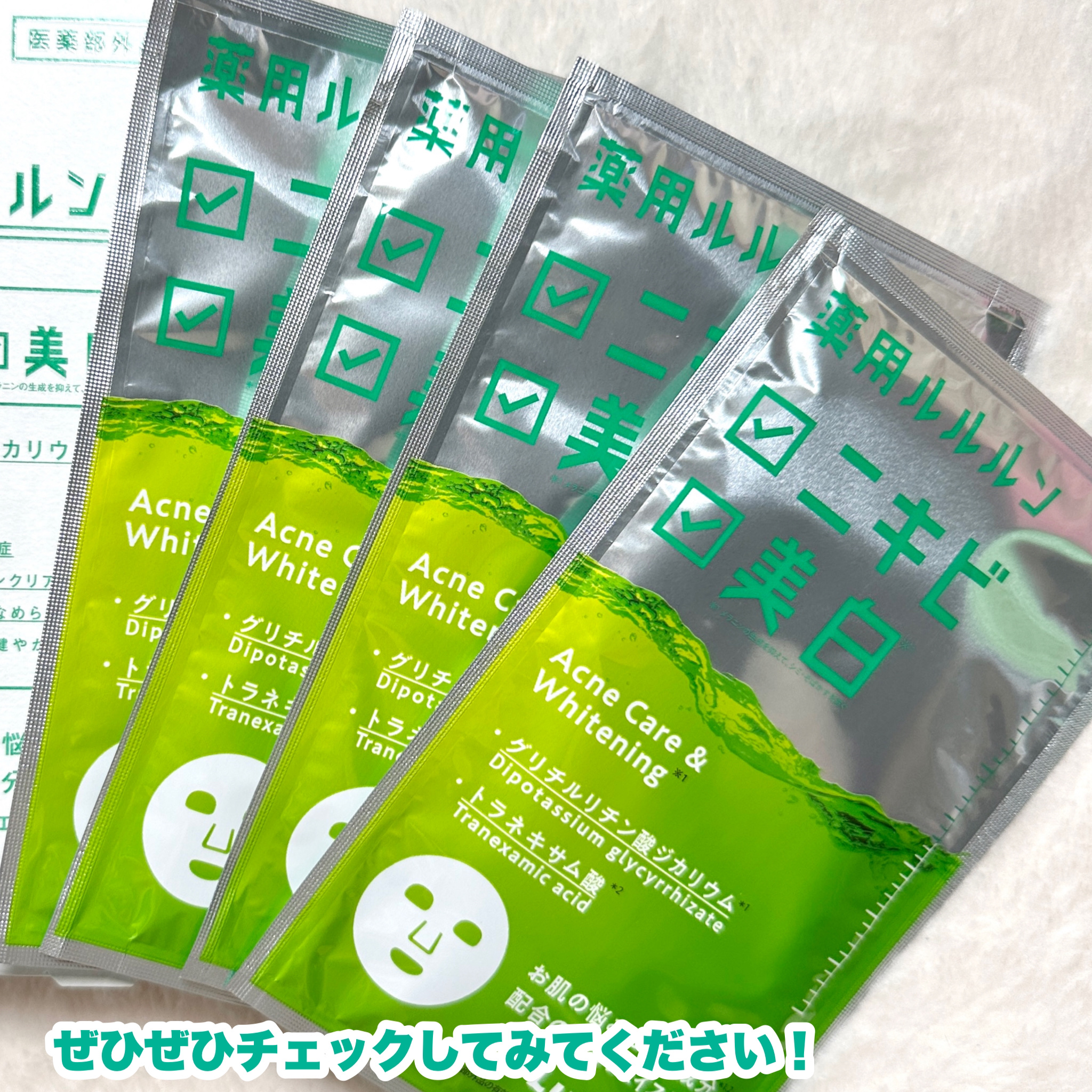 - 【医薬部外品】 ルルルン初の医薬部外品、「薬用ルルルン」が登場。 「薬用ルルルン 美白アクネ」はニキビを予防したい方、美白※1・くすみ※2をケアしたい方におすすめ。 (※1 メラニンの生成を抑えて、シミ・そばかすを防ぐ ※2乾燥による)