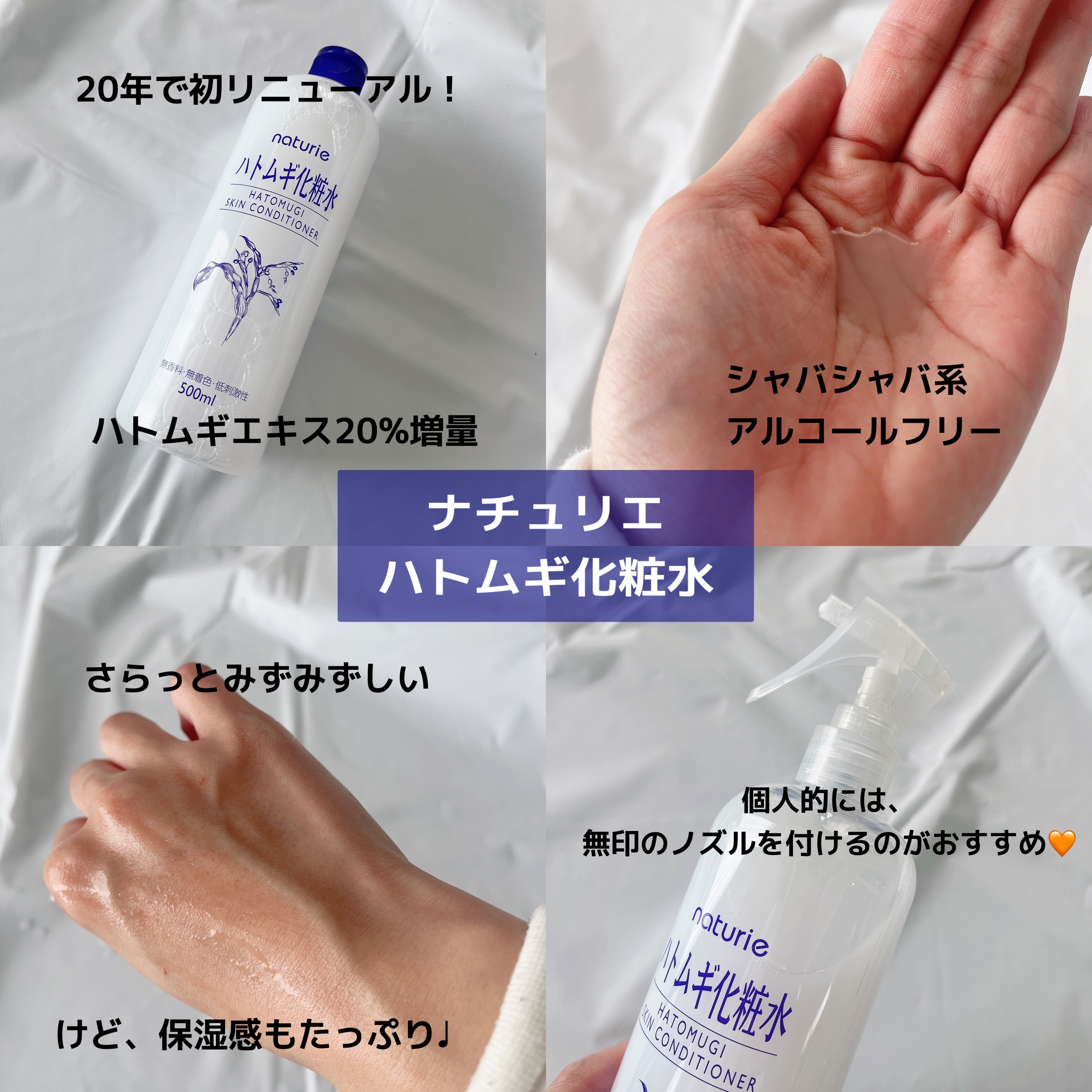 #ナチュリエ#ハトムギ化粧水さっぱりみずみずしい使い心地の化粧水!サラサラ水っぽく、シャバシャバしたテクスチャーでコットンパックするのにちょうどいい。大容量でプチプラで惜しみなく全身に使えるのが嬉しい化粧水です♡スプレーノズルに付け替えると、...