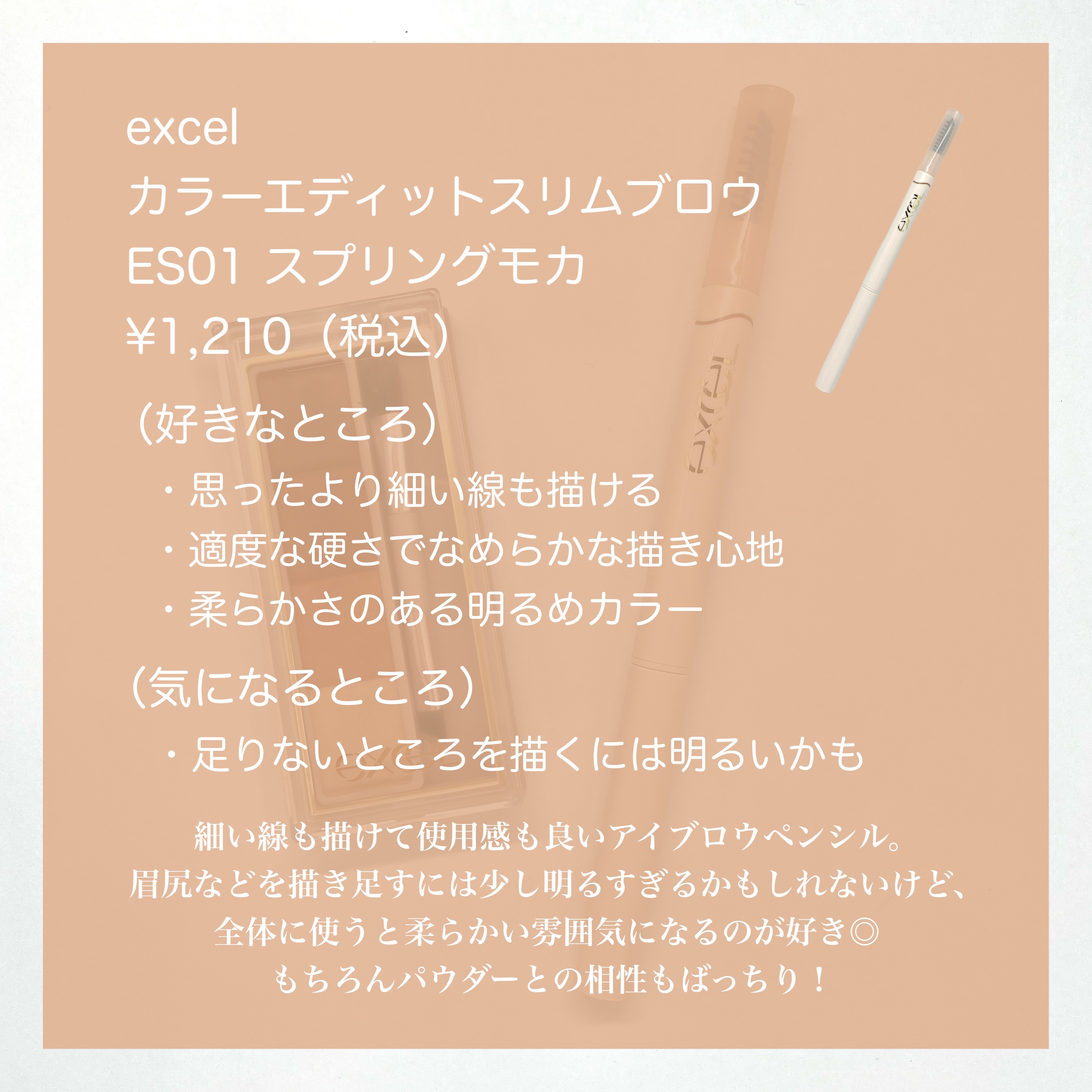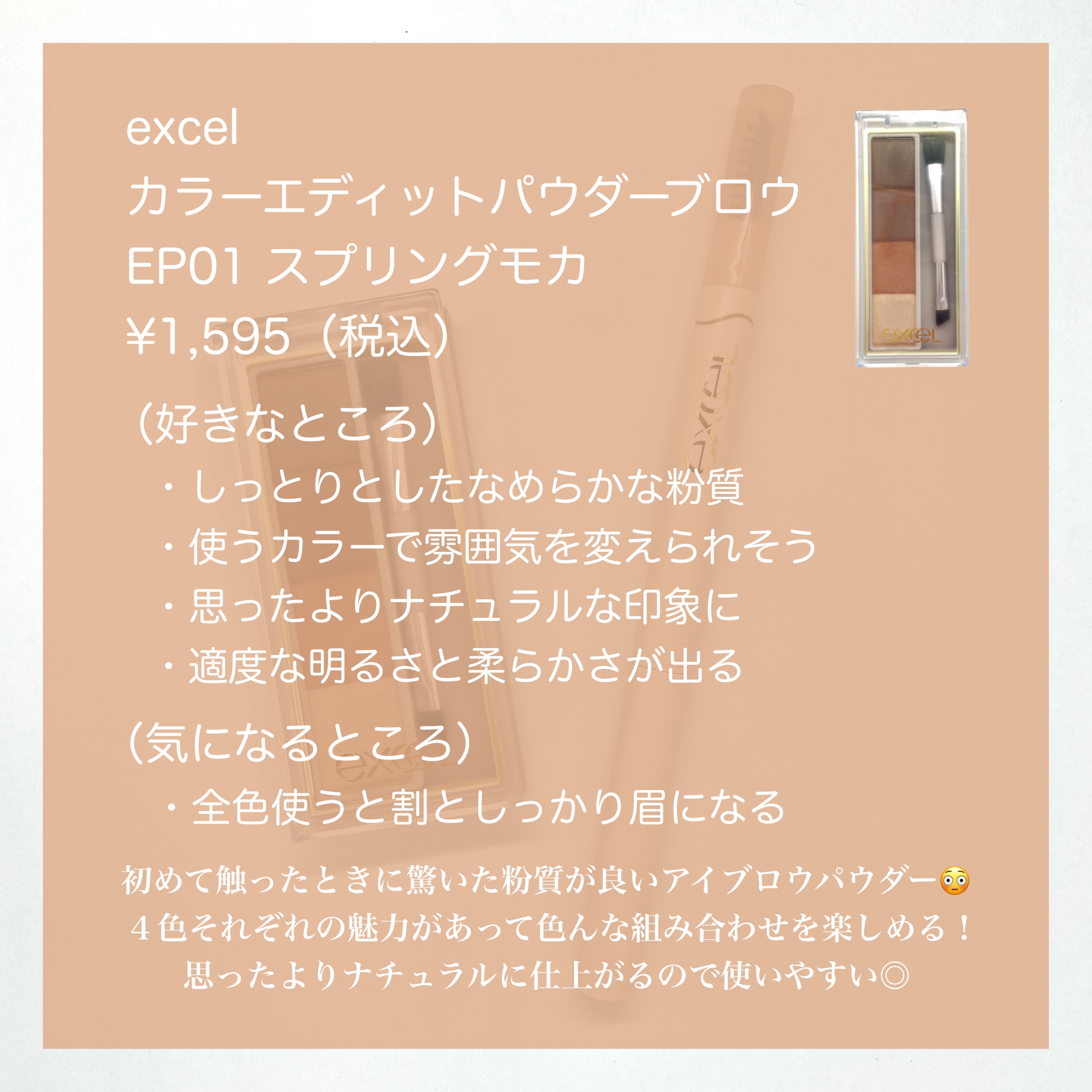 excelカラーエディットパウダーブロウEP01スプリングモカ¥1,595【総評】ふわふわの粉質で柔らかい仕上がり。色味はイエベ春大優勝のコーラルカラー。【仕上がり】総評に書いた通り、ふわふわの粉質で柔らかい仕上がり。色味は鮮やかなコーラルオ...