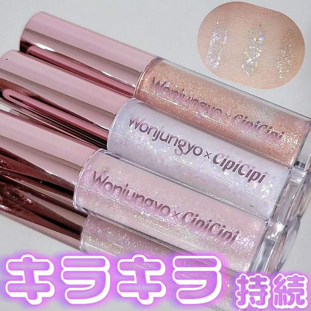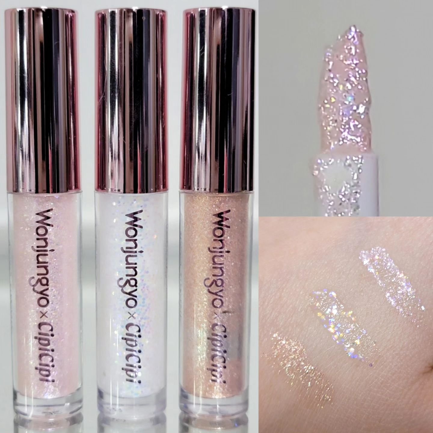 ピンクが主な中に多色グリッターがざくざく入っているライナー💓🩵🩷 結構ざくざくめで大粒のラメがちらちら輝き眩い輝きを放ちます✨✨ フラッシュたいて撮るとその輝き感がより分かります!