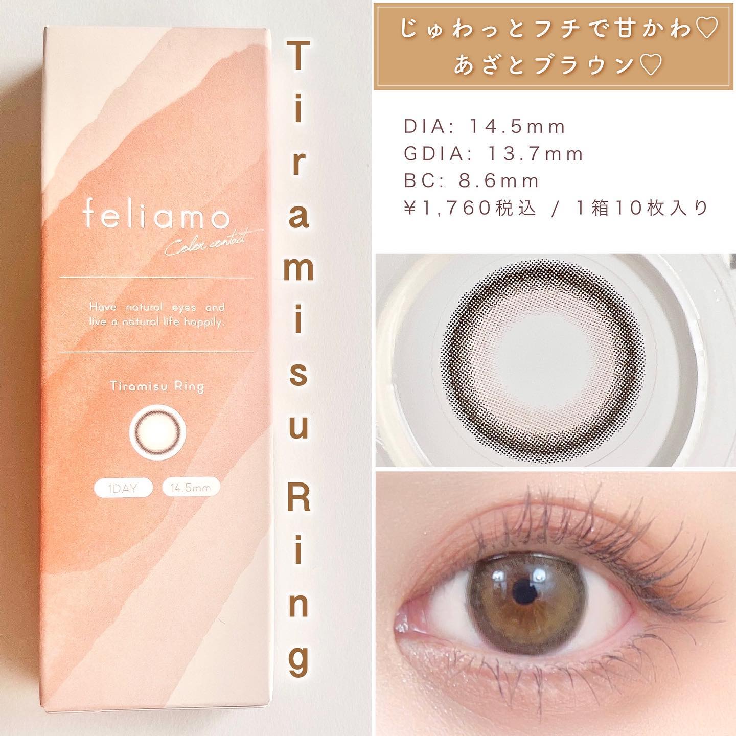 - ※2025年6月以降、商品パッケージ裏面・側面の一部表記を順次変更いたします。尚、これにかかる商品の交換・返品は承っておりません。 どんな瞬間にも溶け込む誰からも愛される瞳へ feliamoの由来は felice amore~幸せな愛~ 瞳から愛されオーラを放つ好印象レンズで女性らしさと品を演出。 オンも、オフも、特別な日も。 どんな場面にも溶け込むレンズラインナップで誰からも愛される瞳に。 UV CUT Feature1 肌や瞳に有害といわれ、白内障などの眼病を引き起こす危険性のある紫外線を99%カットします。(UV-A波75%、UV-B波99%カット) イオン性 Feature1 水分を多く含み酸素を通しやすいため瞳にやさしい使い心地で、快適な装用感です。 高含水 Feature1 水分が多く含むやわらかい素材で、快適なつけ心地です。 レンズ構造 Feature1 まぶた側に着色剤を内包しているため、角膜に色素が触れることがない構造を採用しています。 レンズ形状 Feature1 フチを丸みのある形状にすることで自然な装用感を実現しました。 ※装用感には個人差があります。 カラーコンタクトレンズの不適正使用による眼障害の危険性等などがあります。 ●コンタクトレンズは高度管理医療機器です。不十分な洗浄・消毒など不適切なケアや、長時間・交換期間を超えた装用により、アレルギー性結膜炎、角膜感染症、角膜潰瘍等の重篤な眼障害が発生する危険性があります ●ご使用前に取扱説明書を確認してください 使用上の留意事項 ●眼科医院等を受診してからお求めください ●眼に異常を感じたら直ちにレンズ使用を中止し、お近くの眼科等で診察を受けてください ●医師の指示にしたがってご使用ください ●コンタクトレンズを装用する場合、自覚症状がなくても、眼科医院等での定期検査を受けてください ●レンズに不具合がある場合は使用しないでください