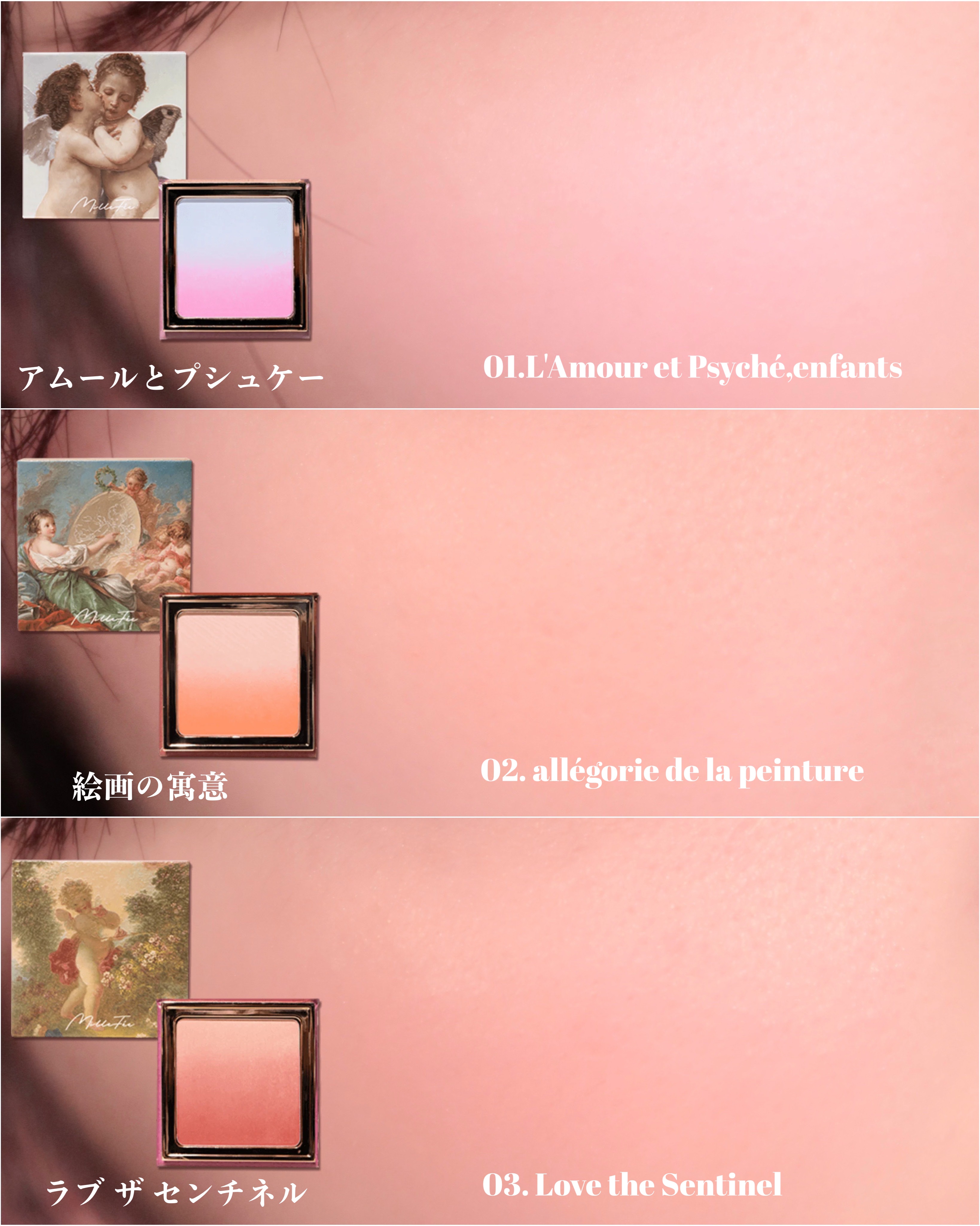 ハイライト的な明るいパウダーから血色のあるカラーまでグラデーションになっているチーク♡ ふわっ&しっとりした粉質。ほんのりパールでさりげなく艶やかに仕上がりますが、ふわっと肌にヴェールをかけたような感じにのるので、ツヤによっておこる毛穴目立ちも少なめ◎ グラデーションになっているので、取る場所によって色々なカラーが楽しめるので、繊細なカラーを出したい方は小さめなブラシで部分的にのせ、全体的なカラーを楽しみたい方は大きめブラシでクルクルッと混ぜて含ませてのせるのが良き◎