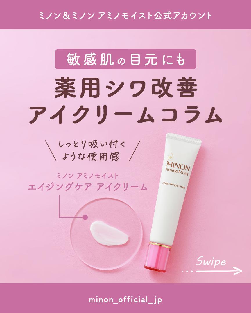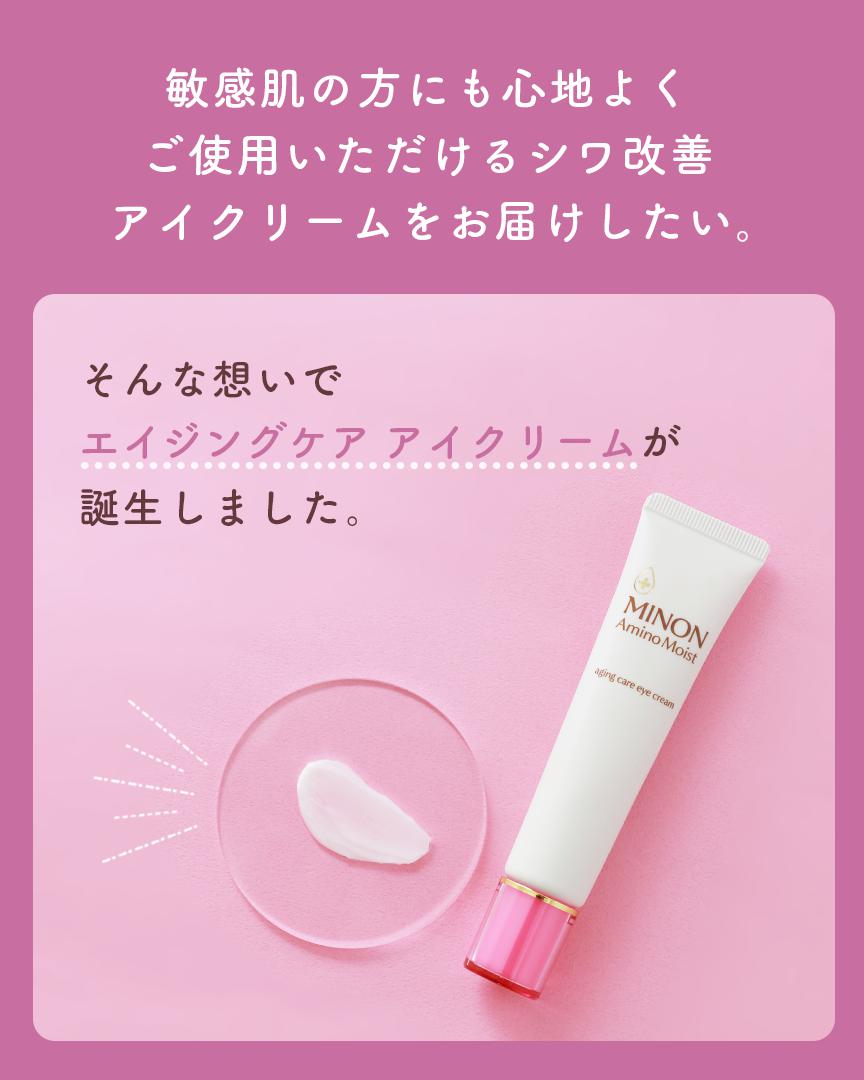 - 【敏感肌も使える薬用シワ改善アイクリーム】 ダブルの有効成分配合。気になるシワを改善し、しみ・そばかす*1、肌あれを防ぎます。 ●ナイアシンアミド:シワ改善&しみ予防 ●グリチルリチン酸2K:肌あれ予防 ハリを与えつや肌に導く「ハリシェイプペプチドWR*2」配合。 使い続けるたび、シワを改善し、うるおってハリのある明るい印象の目元へ。 エイジングケア:年齢に応じたお手入れケア *1メラニンの生成を抑え、しみ・そばかすを防ぐ *2ヤシ油脂肪酸水解コラーゲンK (販売名:ミノンアミノモイストAE)【医薬部外品】