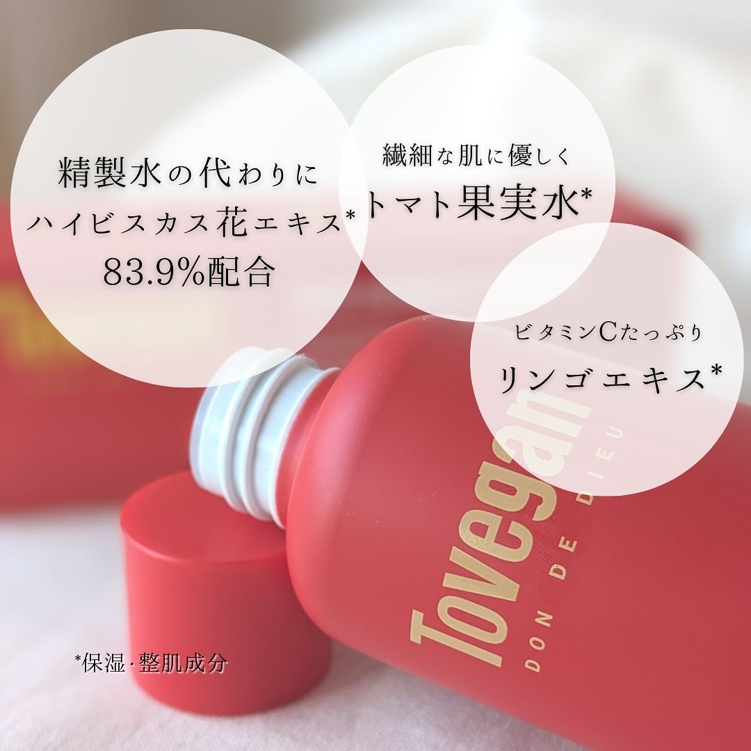 - 精製水の代わりにハイビスカスエキス*が83.9%も配合した赤ちゃんのようなゆでたまご肌を目指せる化粧水です。さっき洗顔したかのような肌の角質層までしっとり潤わせてくれます。ハイビスカスやトマトをイメージさせるリコピンカラーの赤みがあるトナーです。拭き取り化粧水として角質ケアもしていただけます。弱酸性で、敏感肌さんもお使いいただけます! *保湿成分