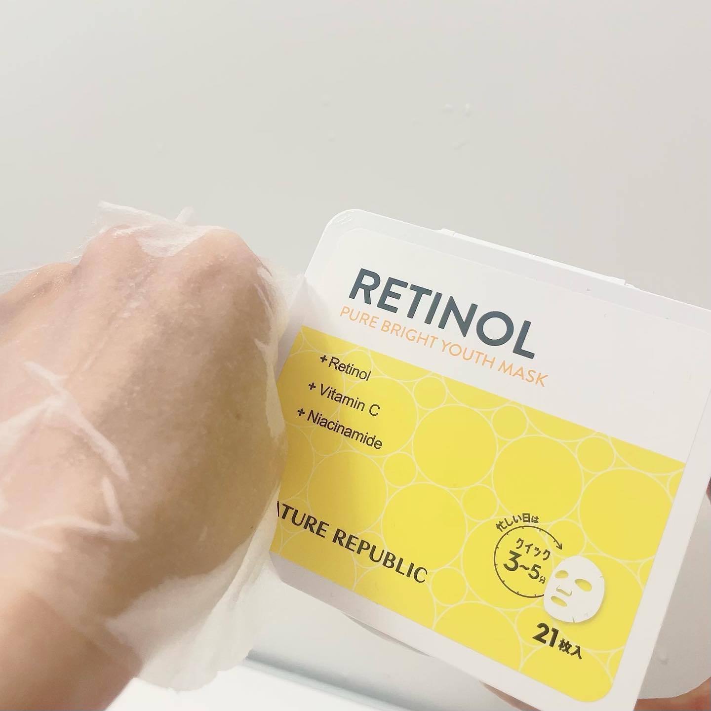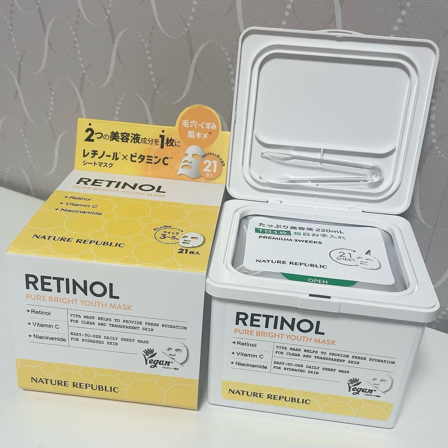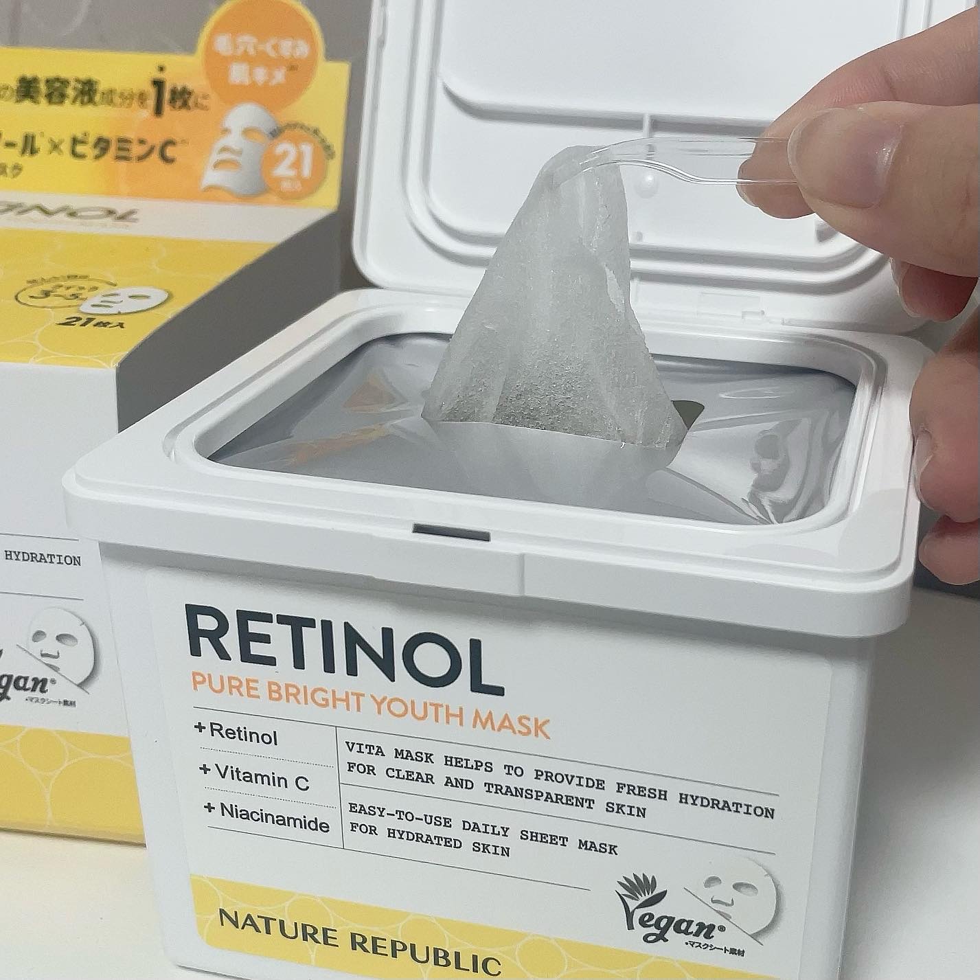 ネイチャーリパブリックのキューブマスク🟨・レチノールピュアブライトユースシートマスクヴィーガンのシートマスクにウォータータイプの美容液がヒタヒタに染み込んでいて、角質層のすみずみまでぐんぐん浸透💛くすんだお肌もワントーンアップしました✨レチノ...