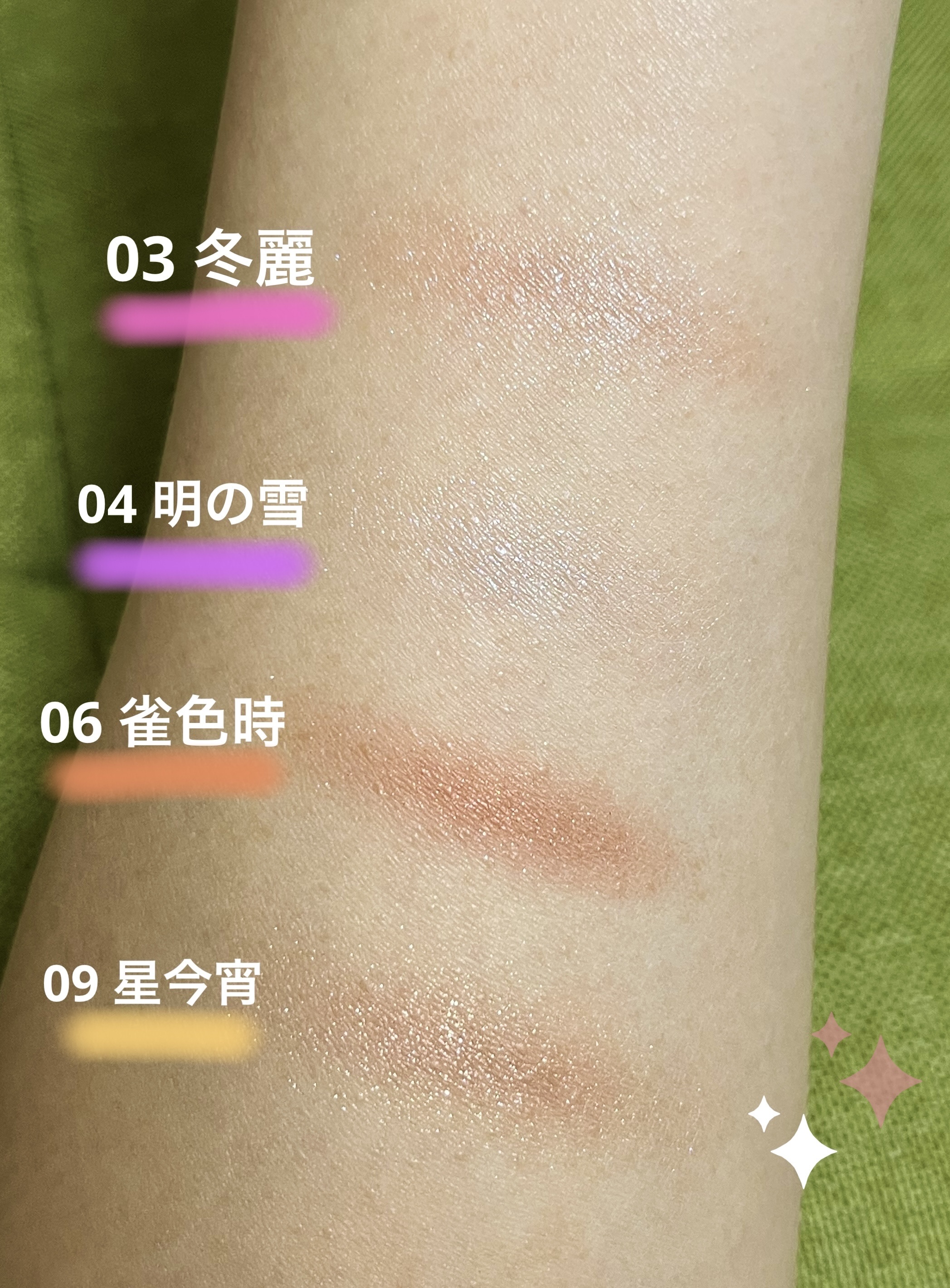 03 冬麗 肌なじみの良い淡いピンクが可愛くて、そこにパールのキラキラがとても綺麗です。 04 明の雪 色よりもパールの輝きが特徴的です。角度を変えるごとに光に反射して最高です。 06 雀色時 つやっとしたオレンジです。発色が良くてすごく可愛いです。1番のお気に入り! 09 星今宵 06雀色時よりももう少しピンクに寄った感じの色です。これも可愛い!