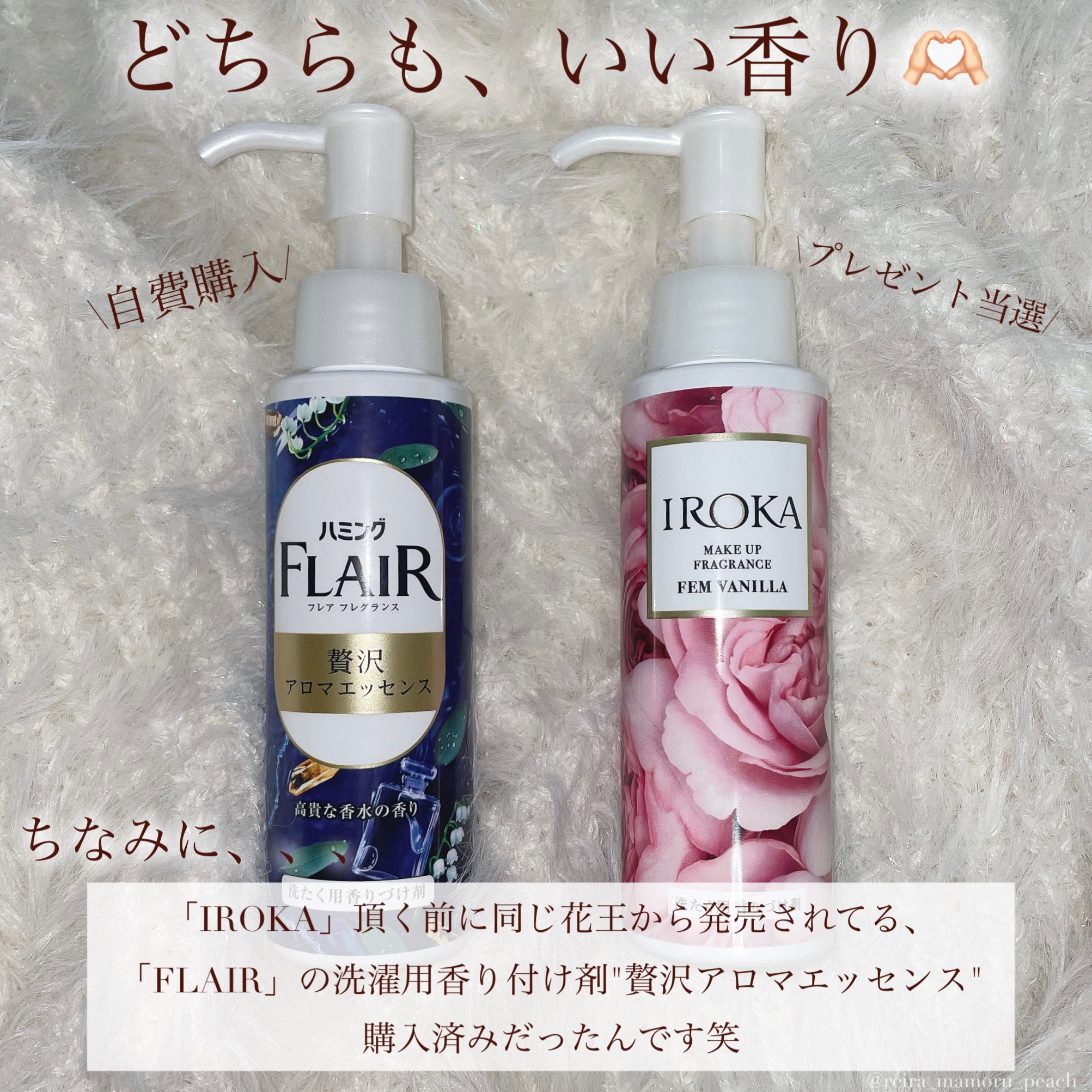 - 【洗たく用香りづけ剤】 <柔軟剤と一緒に入れて、上質をまとう 香水エッセンス> IROKAこだわりの厳選香料を贅沢*1に配合。 いつもの柔軟剤と一緒に入れるだけで、まるで香水のように上質な香りへ。 その特別な香りは、あなたを優雅で洗練された印象へと誘う。 *1 花王柔軟剤との比較 計量いらずのプッシュタイプで使いやすく、香りの好みに合わせてプッシュ回数を調整してお楽しみ頂けます。 <柔軟剤との組み合わせ自由> 香料を厳選した3つの香水エッセンス ◆フェム・バニラ:甘くフェミニンな香りをプラス(柔らかく温かみのあるバニラがふんわりと奥深く漂う香り) ◆センシュアル・アンバー:艶やかな大人の香りをプラス(上質なアンバーを贅沢に使った 艶やかで洗練された香り) ◆ハンサム・シトラス:凛とした爽やかな香りをプラス(ベルガモットにジンジャーリリーの深みを加えた 上品で爽やかな香り) ●香料厳選 ●上質な香り続く ●計量いらず プッシュタイプ(約110プッシュ分) ●液体だから溶け残りなし ●収納しやすいコンパクトな容器 ※23年10月パッケージリニューアル