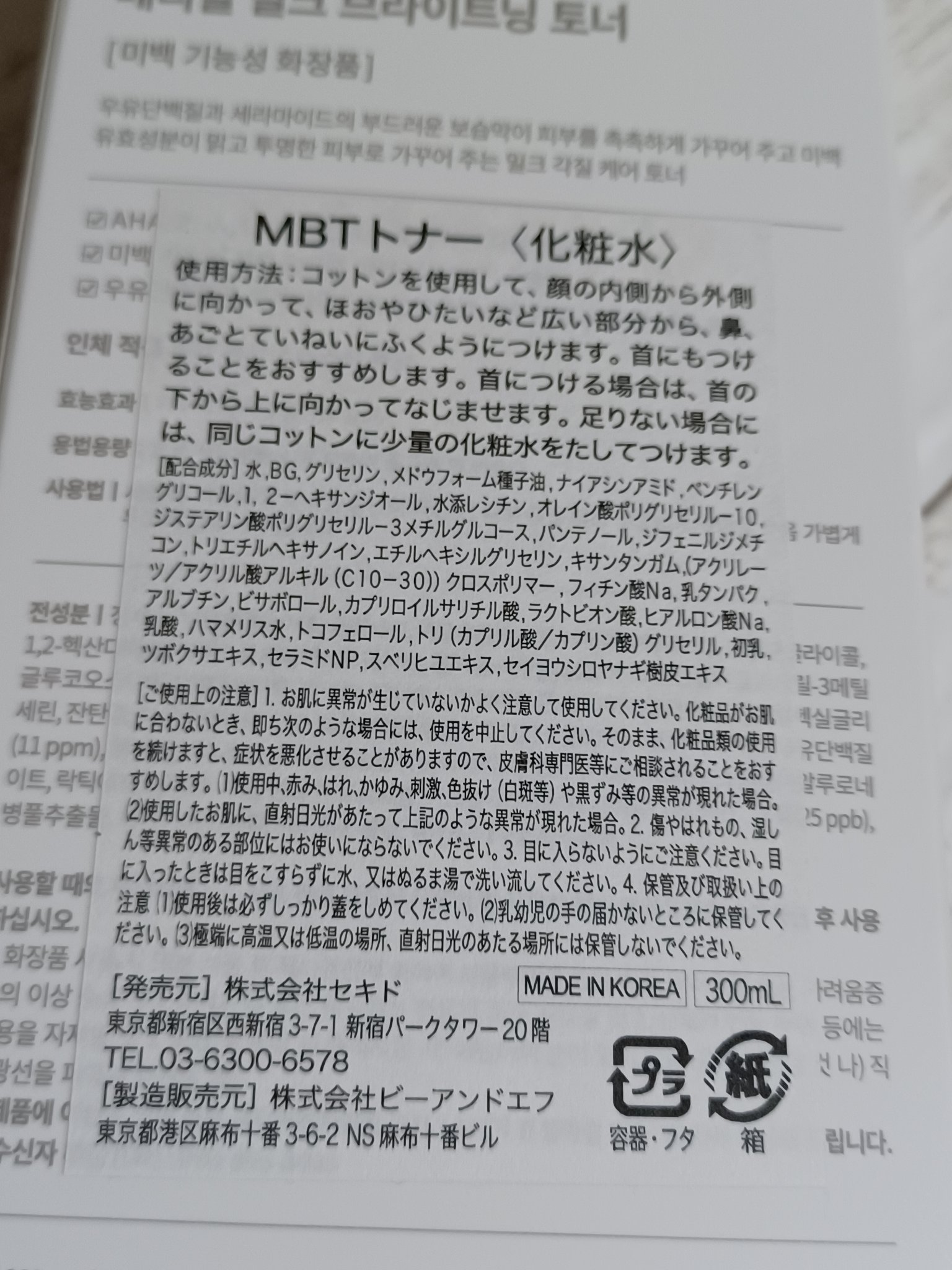 - <300ml> 水、ペンチレングリコール、BG、グリセリン、ヒアルロン酸Na、キサンタンガム、トコフェロール、トリエチルヘキサノイン、エチルヘキシルグリセリン、ツボクサエキス、スベリヒユエキス、乳酸、水添レシチン、セラミドNP、オレイン酸ポリグリセリル-10、パンテノール、アルブチン、ビサボロール、1,2-ヘキサンジオール、メドウフォーム油、(アクリレーツ/アクリル酸アルキル(C10-30))クロスポリマー、トリ(カプリル酸/カプリン酸)グリセリル、セイヨウシロヤナギ樹皮エキス、ナイアシンアミド、ハマメリス水、カプリロイルサリチル酸、ジフェニルジメチコン、ジステアリン酸ポリグリセリル-3メチルグルコース、ラクトビオン酸、フィチン酸Na、乳タンパク、初乳