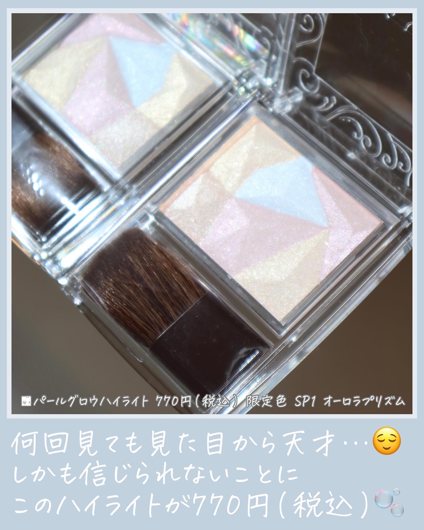 これ、ジェル状のハイライトなんだけど 肌にのせるとツヤ感がめちゃくちゃ綺麗で 一気に抜け感&色っぽさUP。 顔に使うのももちろん可愛いんだけど… 夏なのでね。デコルテが出る服の時は 鎖骨にのせるとモテ感爆発します💥 耳たぶにちょんっとつけても 本当可愛いのでコレも推し。 ちなみに保湿成分もたっぷり入ってるので 一石二鳥だよん♡ もち運びもしやすいコンパクトサイズなので お仕事終わりにちょんっとつけたり、 メイク直しに使ったりもう大活躍間違いなし。 しかもこのクオリティで1200円。超優秀。