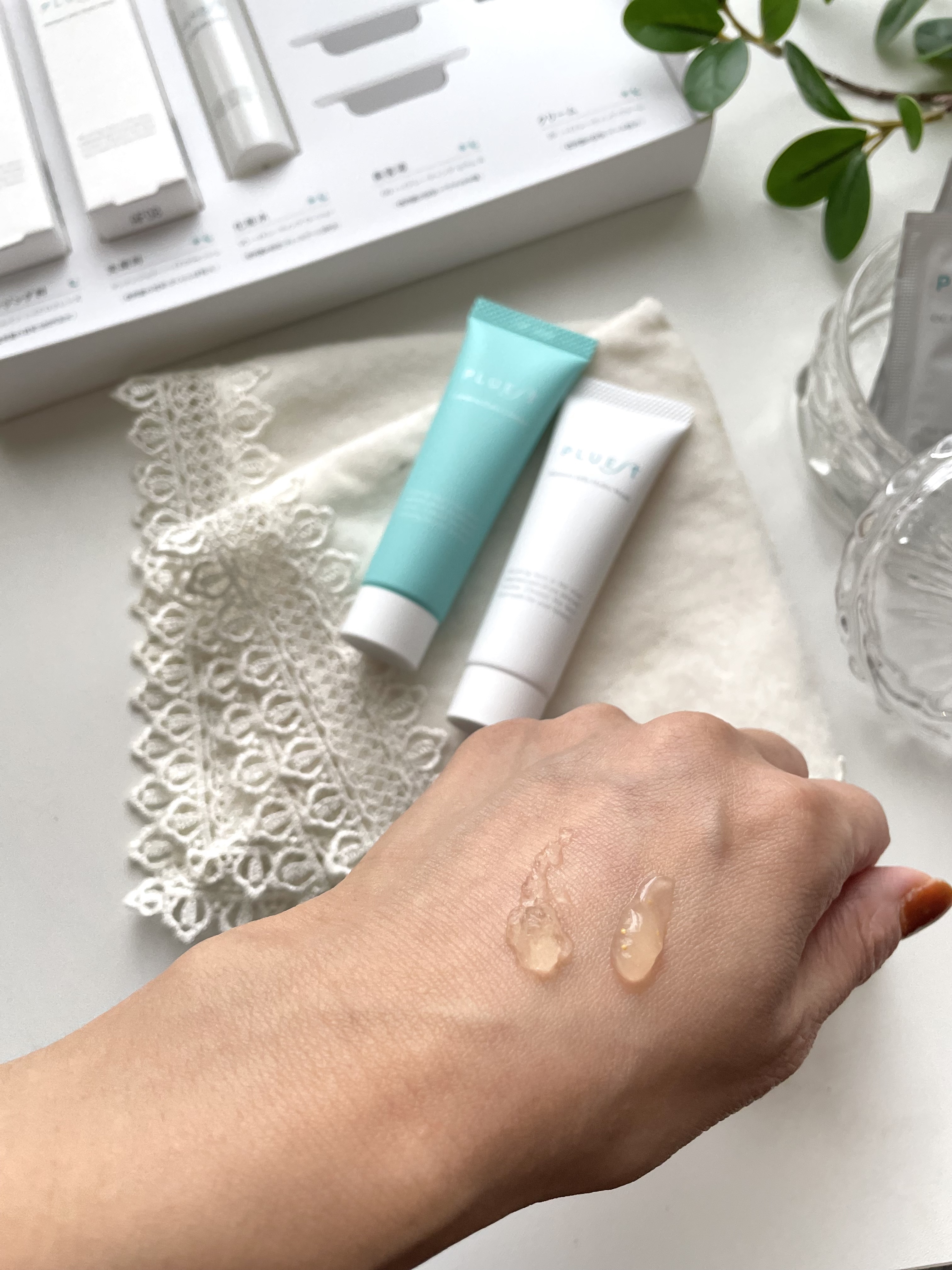 化粧水は甘めの香りで、少しとろみがあり肌に馴染ませやすいです。 美容液もとろみがあり、伸びが良く、少量でも顔全体にしっかり塗ることができます。 クリームは柔らかいテクスチャで、しっかり保湿し、モチッとした肌になりました。