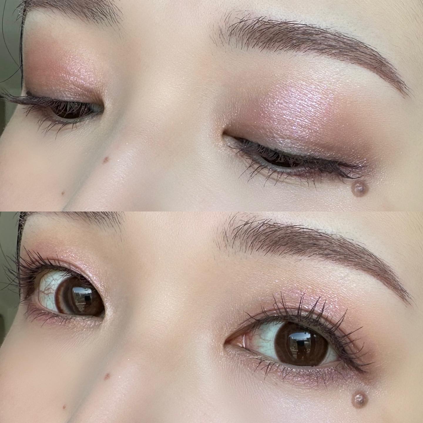 手に試した感じではベースのブルーは弱く、ラメ自体がブルーで可愛すぎる…! BAさんはパウダーアイシャドウのベースにもおすすめと教えてくれたので、 今日はこちらをベースにピンクブラウン系の アイシャドウを使ってメイクしてみたよ🫶🏻 肌に伸ばすとすぐにサラサラになるから ベタベタが残ったりしないし、 パウダーアイシャドウの上に重ねてもヨレない◎