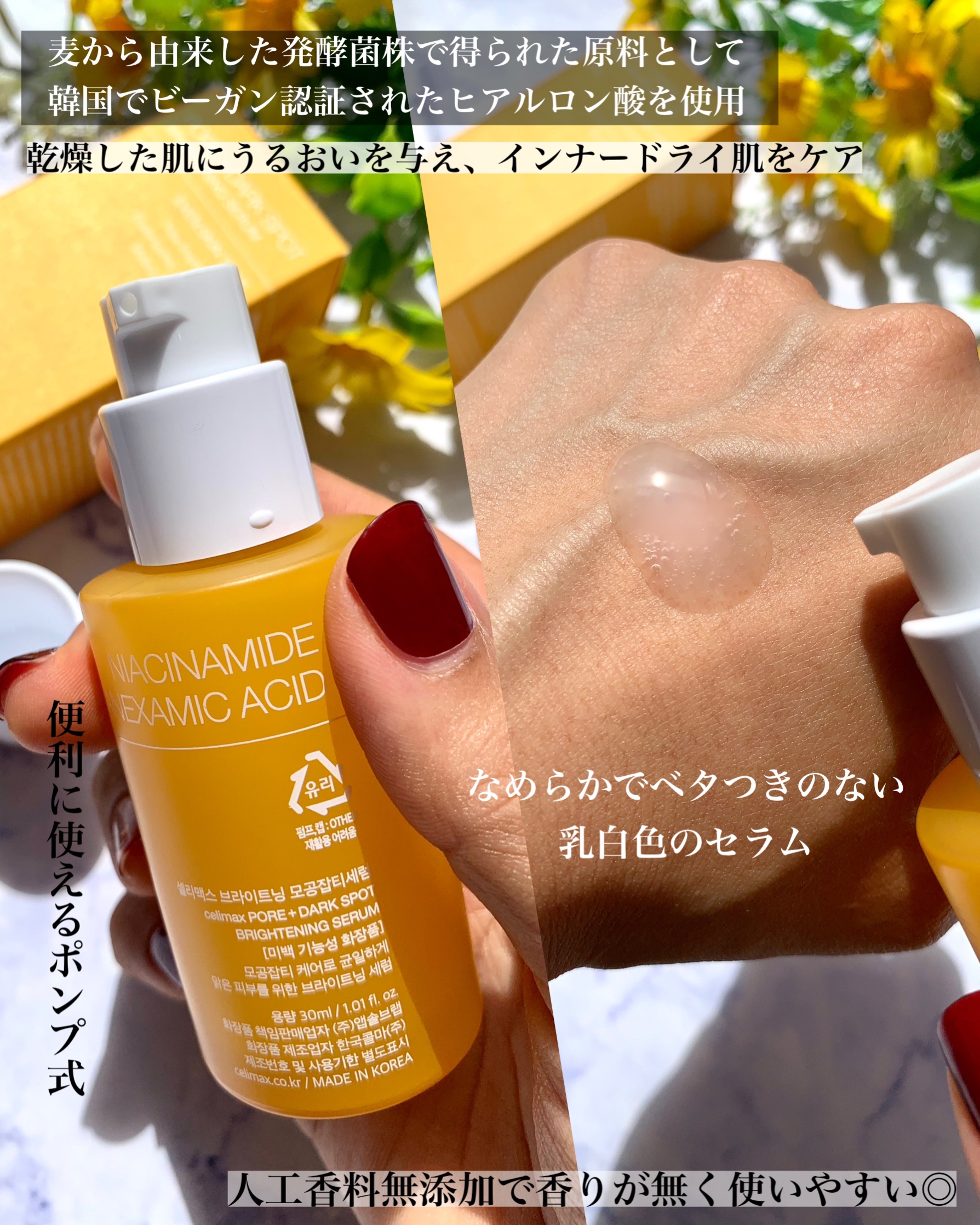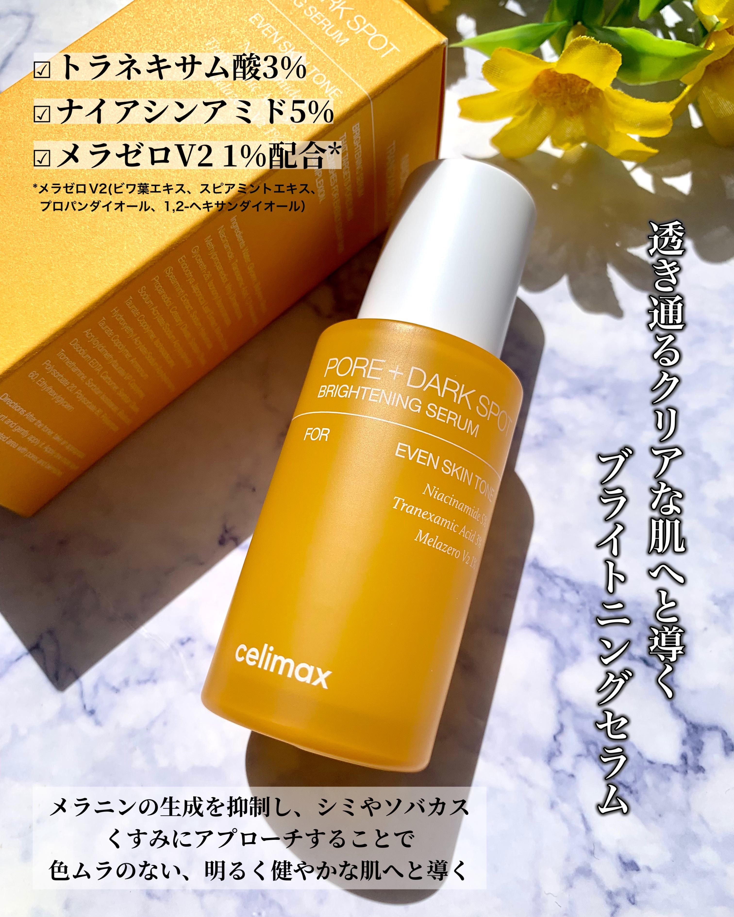 #PR@celimax.japan様からポアブライトニングシミケアセラムとポアブライトニングシミケアパッドをいただきました😻ありがとうございます!シミ•くすみだけじゃなくて毛穴ケアも😊トラネキサム酸、ナイアシンアミド、メラゼロV2*配合。(※...