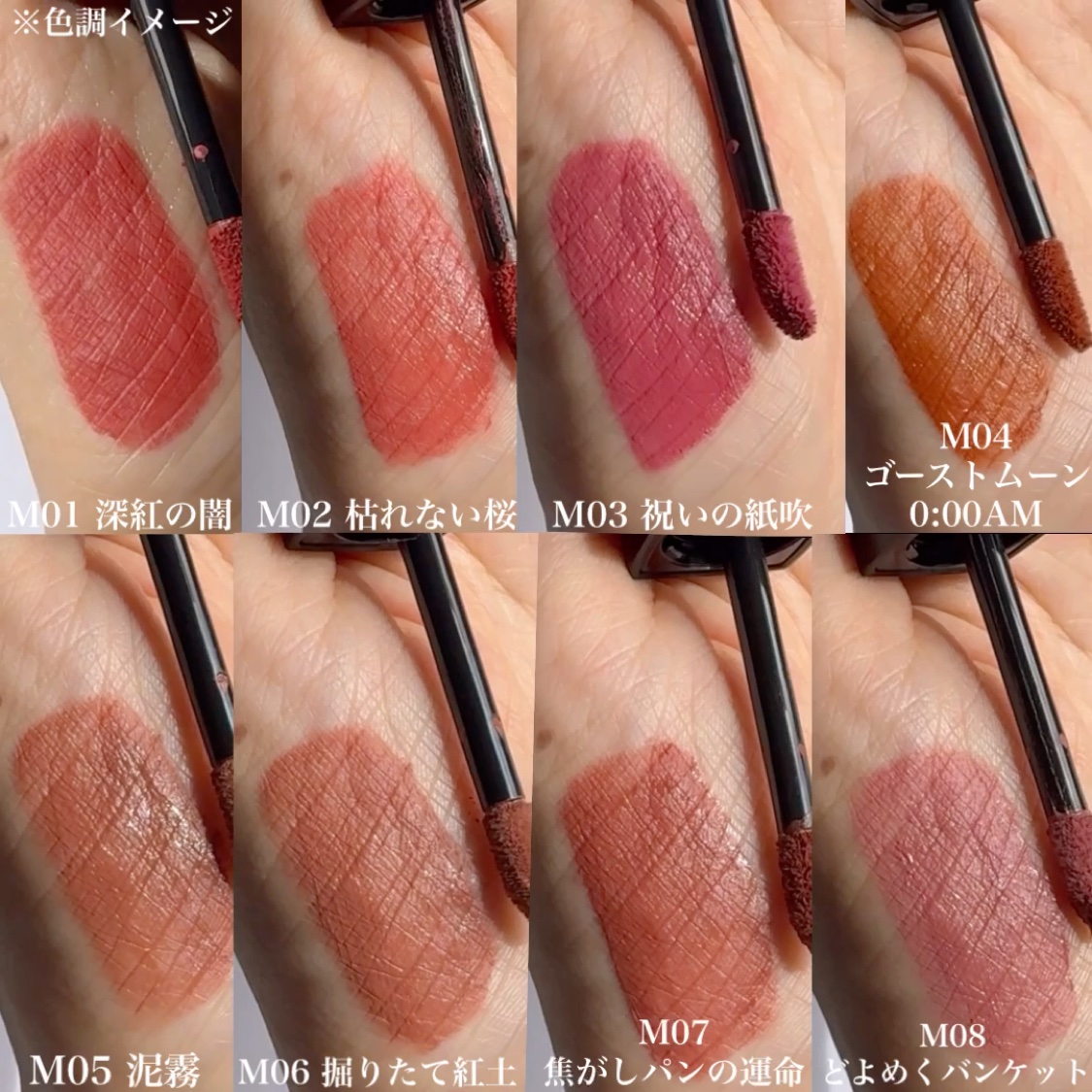 - <EX-1 蜜柑雲シフォン(限定)> ジメチコン、合成フルオロフロゴパイト、イソドデカン、メチルトリメチコン、シリカ、(ジメチコン/ビニルジメチコン)クロスポリマー、トリメチルシロキシケイ酸、(アクリレーツ/ジメチコン)コポリマー、ポリグリセリル-3ポリジメチルシロキシエチルジメチコン、パルミチン酸デキストリン、(ジビニルジメチコン/ジメチコン)コポリマー、ジステアルジモニウムヘクトライト、水、トリ(カプリル酸/カプリン酸)グリセリル、炭酸プロピレン、(C12,13)パレス-23、(C12,13)パレス-3、フェノキシエタノール、メチルパラベン、エチルパラベン、(+/-)酸化チタン、酸化鉄、水酸化Al、黄4、青1、赤202、赤226 <EX-2 羊雲のゆりかご(限定)> ジメチコン、合成フルオロフロゴパイト、イソドデカン、メチルトリメチコン、シリカ、(ジメチコン/ビニルジメチコン)クロスポリマー、トリメチルシロキシケイ酸、(アクリレーツ/ジメチコン)コポリマー、ポリグリセリル-3ポリジメチルシロキシエチルジメチコン、パルミチン酸デキストリン、(ジビニルジメチコン/ジメチコン)コポリマー、ジステアルジモニウムヘクトライト、水、トリ(カプリル酸/カプリン酸)グリセリル、炭酸プロピレン、(C12,13)パレス-23、(C12,13)パレス-3、フェノキシエタノール、メチルパラベン、エチルパラベン、(+/-)酸化チタン、酸化鉄、水酸化Al、黄4、青1、赤202、赤226 <M01 深紅の闇> ジメチコン、合成フルオロフロゴパイト、イソドデカン、メチルトリメチコン、シリカ、(ジメチコン/ビニルジメチコン)クロスポリマー、トリメチルシロキシケイ酸、(アクリレーツ/ジメチコン)コポリマー、ポリグリセリル-3ポリジメチルシロキシエチルジメチコン、パルミチン酸デキストリン、ジステアルジモニウムヘクトライト、(ジビニルジメチコン/ジメチコン)コポリマー、トリ(カプリル酸/カプリン酸)グリセリル、水、炭酸プロピレン、(C12,13)パレス-23、(C12,13)パレス-3、フェノキシエタノール、メチルパラベン、エチルパラベン、(+/-)酸化チタン、酸化鉄、水酸化Al、黄4、青1、赤202、赤226 <M02 枯れない桜> ジメチコン、合成フルオロフロゴパイト、イソドデカン、メチルトリメチコン、シリカ、(ジメチコン/ビニルジメチコン)クロスポリマー、トリメチルシロキシケイ酸、(アクリレーツ/ジメチコン)コポリマー、ポリグリセリル-3ポリジメチルシロキシエチルジメチコン、パルミチン酸デキストリン、ジステアルジモニウムヘクトライト、(ジビニルジメチコン/ジメチコン)コポリマー、トリ(カプリル酸/カプリン酸)グリセリル、水、炭酸プロピレン、(C12,13)パレス-23、(C12,13)パレス-3、フェノキシエタノール、メチルパラベン、エチルパラベン、(+/-)酸化チタン、酸化鉄、水酸化Al、黄4、青1、赤202、赤226 <M03 祝いの紙吹雪> ジメチコン、合成フルオロフロゴパイト、イソドデカン、メチルトリメチコン、シリカ、(ジメチコン/ビニルジメチコン)クロスポリマー、トリメチルシロキシケイ酸、(アクリレーツ/ジメチコン)コポリマー、ポリグリセリル-3ポリジメチルシロキシエチルジメチコン、パルミチン酸デキストリン、ジステアルジモニウムヘクトライト、(ジビニルジメチコン/ジメチコン)コポリマー、トリ(カプリル酸/カプリン酸)グリセリル、水、炭酸プロピレン、(C12,13)パレス-23、(C12,13)パレス-3、フェノキシエタノール、メチルパラベン、エチルパラベン、(+/-)酸化チタン、酸化鉄、水酸化Al、黄4、青1、赤202、赤226 <M04 ゴーストムーン0:00AM> ジメチコン、合成フルオロフロゴパイト、イソドデカン、メチルトリメチコン、シリカ、(ジメチコン/ビニルジメチコン)クロスポリマー、トリメチルシロキシケイ酸、(アクリレーツ/ジメチコン)コポリマー、ポリグリセリル-3ポリジメチルシロキシエチルジメチコン、パルミチン酸デキストリン、ジステアルジモニウムヘクトライト、(ジビニルジメチコン/ジメチコン)コポリマー、トリ(カプリル酸/カプリン酸)グリセリル、水、炭酸プロピレン、(C12,13)パレス-23、(C12,13)パレス-3、フェノキシエタノール、メチルパラベン、エチルパラベン、(+/-)酸化チタン、酸化鉄、水酸化Al、黄4、青1、赤202、赤226 <M05 泥霧> ジメチコン、合成フルオロフロゴパイト、イソドデカン、メチルトリメチコン、シリカ、(ジメチコン/ビニルジメチコン)クロスポリマー、トリメチルシロキシケイ酸、(アクリレーツ/ジメチコン)コポリマー、ポリグリセリル-3ポリジメチルシロキシエチルジメチコン、パルミチン酸デキストリン、ジステアルジモニウムヘクトライト、(ジビニルジメチコン/ジメチコン)コポリマー、トリ(カプリル酸/カプリン酸)グリセリル、水、炭酸プロピレン、(C12,13)パレス-23、(C12,13)パレス-3、フェノキシエタノール、メチルパラベン、エチルパラベン、(+/-)酸化チタン、酸化鉄、水酸化Al、黄4、青1、赤202、赤226 <M06 掘りたて紅土> ジメチコン、合成フルオロフロゴパイト、イソドデカン、メチルトリメチコン、シリカ、(ジメチコン/ビニルジメチコ