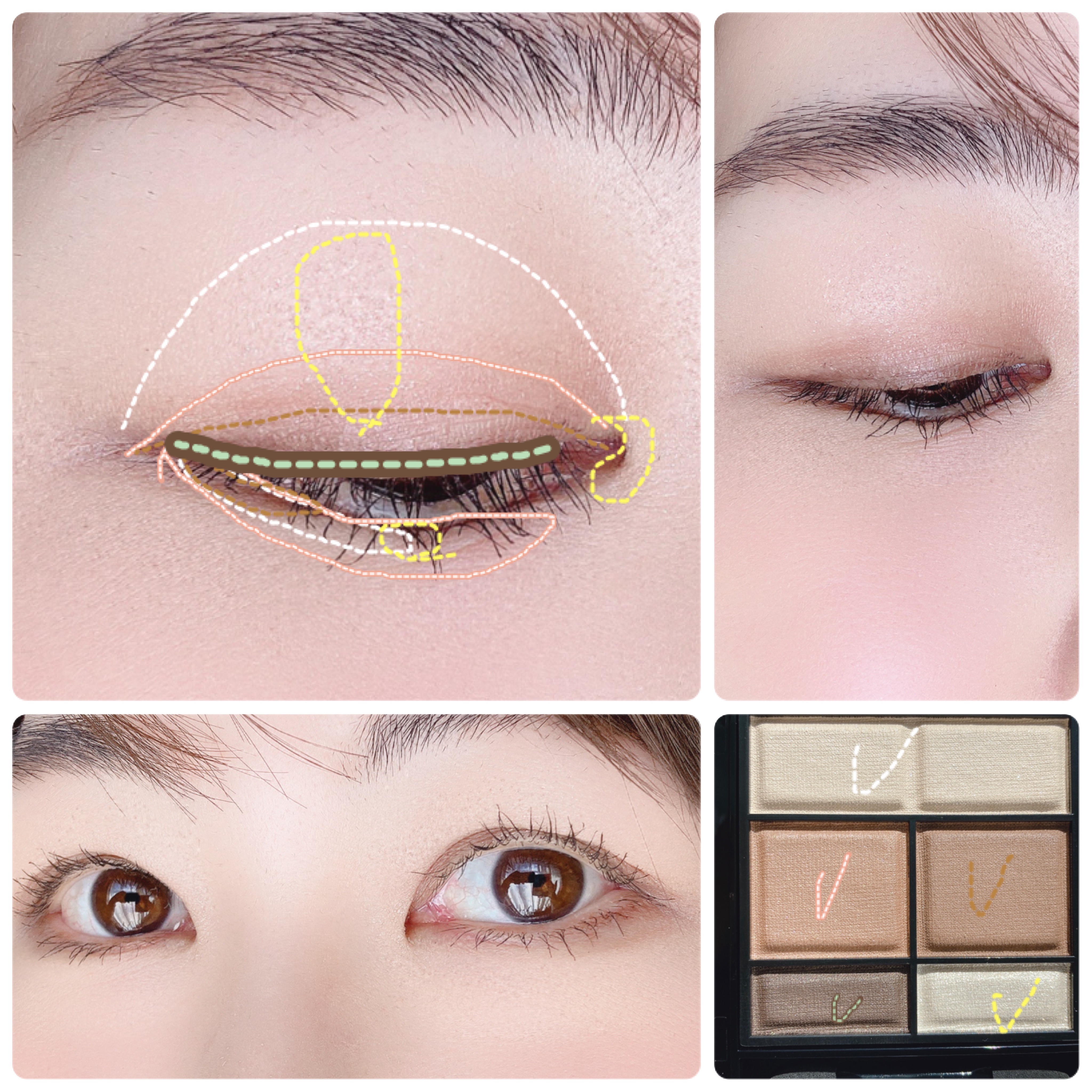 左からバームハイライト。色はつかず、ほんのりツヤが出ます。上に重ねるパウダーがヨレにくくなるので、パウダーハイライトのベースに塗ってレイヤードを楽しむのもおすすめ。 左から2番目のピンク系ハイライト。シルバー系のパールパウダーで明るい印象に。ブルベさんならこちらを多めに使うと馴染みやすいですよ。 左から3番目のベージュハイライト。ゴールド系のパールパウダーで肌馴染みが良い。イエベさんならこちらを多めに使うと馴染みやすいですよ。 右側のマットブラウン。ニュートラルなブラウンのマットパウダー。シェーディングだけでなく、アイブロウパウダーとしても使えます。 ハイライトとシェーディングだけで印象がガラリと変わるし、目元もヌーディーなのに魅力的な仕上がりに。 大人のツヤメイクには必須アイテムです!!