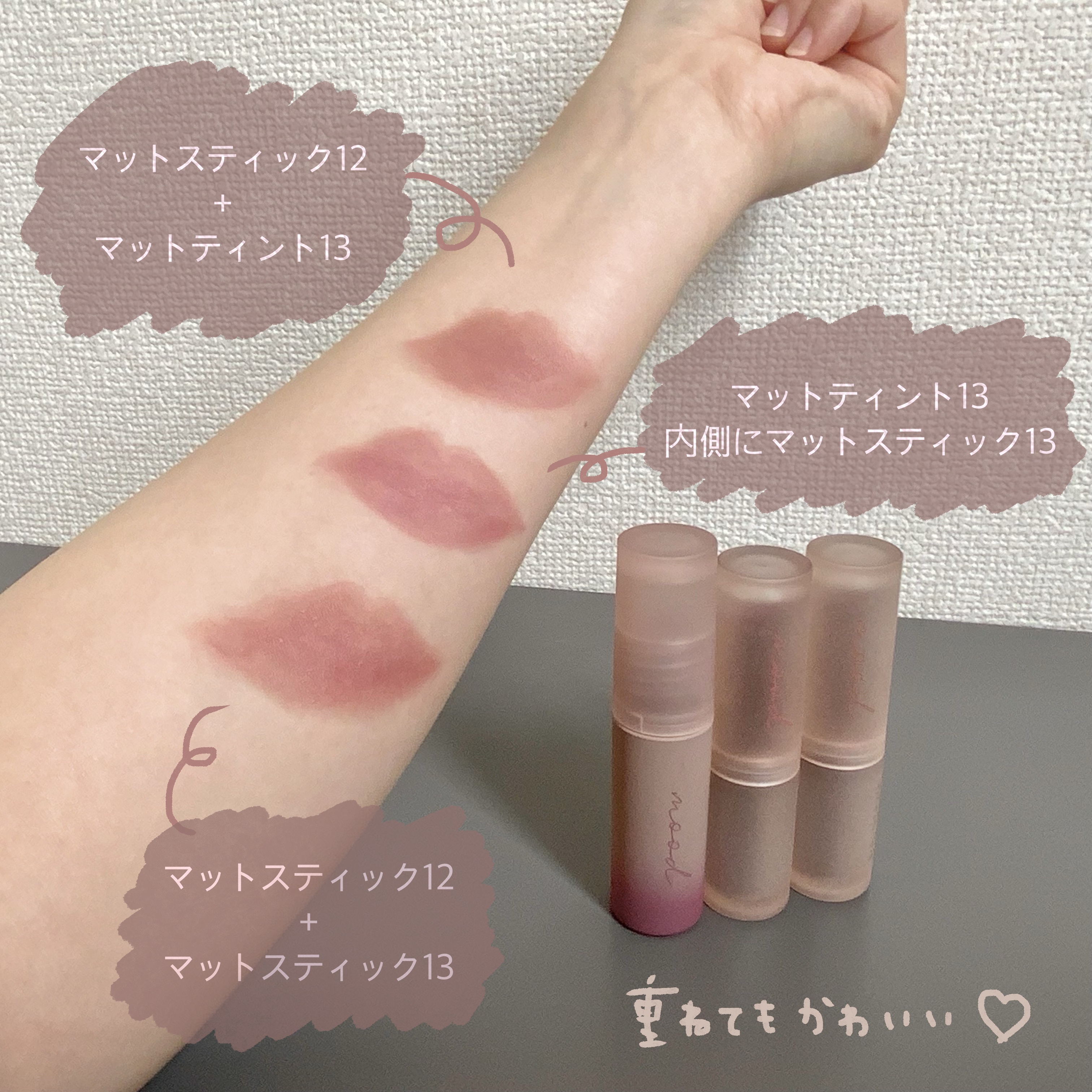 マットスティックは割とクレヨンのような感じで 本当にマット。ボワッとつく。 唇がパウダーを纏う感じ。 塗っている感じがあまりせず軽い。 重ねれば重ねるほど色が重なっていく感じ。 マットティントはスルスル〜っと滑る。 本当につるんつるんに滑る。 マットスティックよりは 水分があってじわっと濡れている感じ。 色残りもほんのりしてくれる。 一定の場所に決まった量が均一に付く感じ。 出しすぎると席に座れない子がいる感じ。 とにかくパケも色味も本当にかわいくて 最高にテンションの上がる子達です。 その日の服の色やニュアンスに合わせて 自分の好みの色になるように 重ね付けしてもかわいいですし いつものリップに少し加えても ニュアンスを変えてくれてすごく楽しいです。