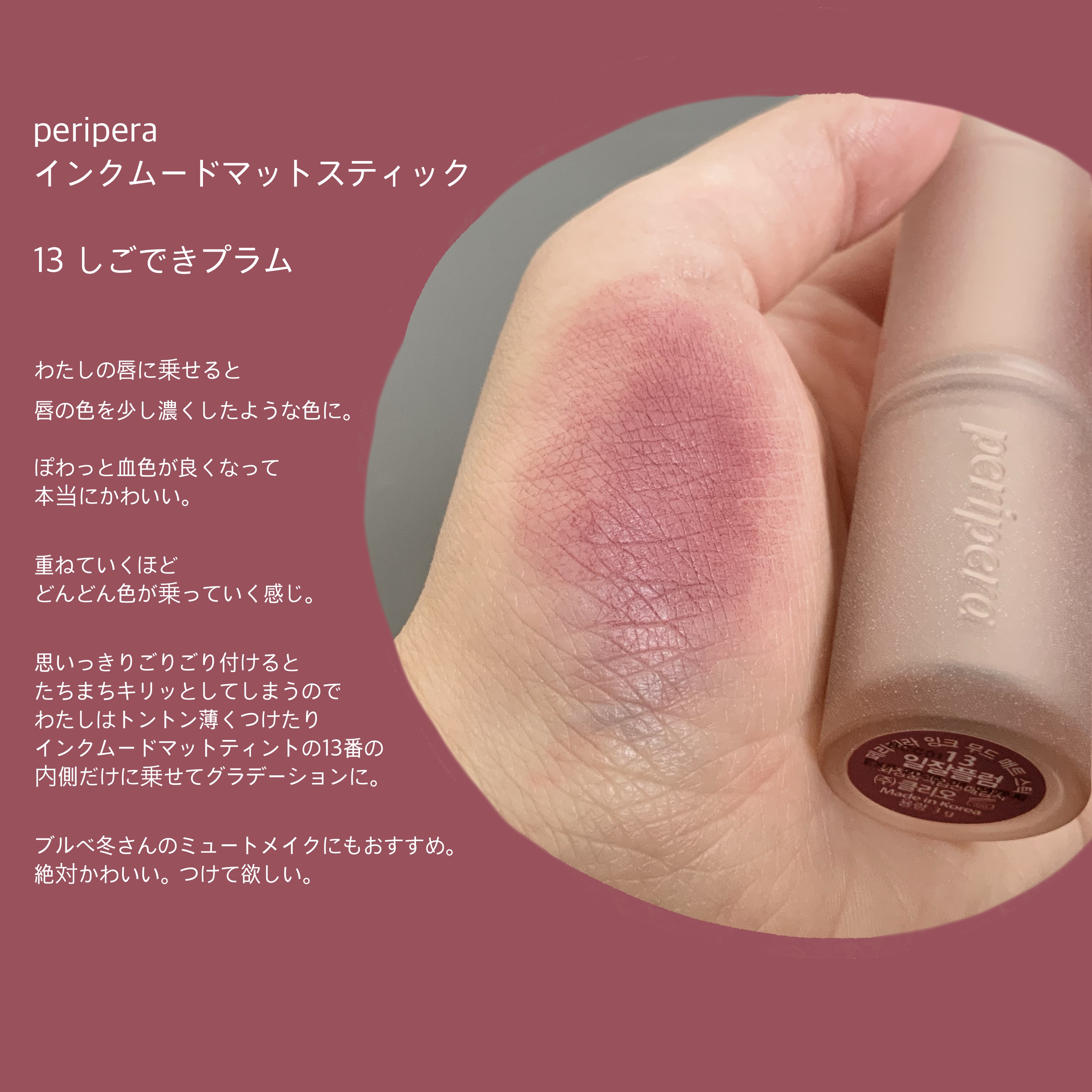 ふわふわしてるのにさらさらしている 不思議な塗り心地なのに乾燥しにくくて秋冬活躍待ったなしなので是非ご覧ください✨️ ✔PERIPERA 『インク ムード マット ティント』 13 ひんぐりモーブ くすみピンク(青みややあり)なので特にブルベさんにおすすめです︎👍🏻